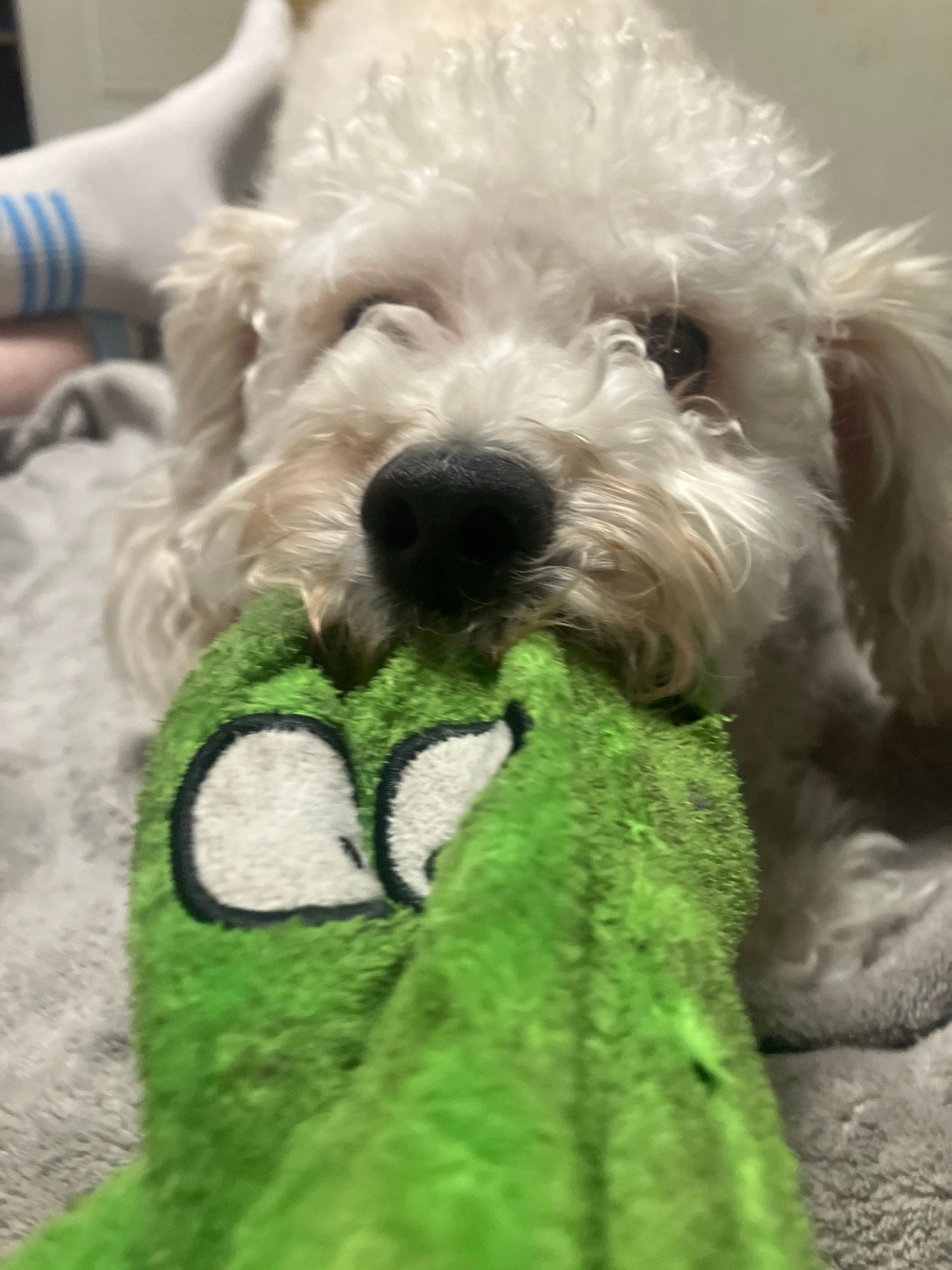 The image captures a close-up, slightly tilted perspective of a small, white, fluffy dog, possibly a Bichon Frise or Poodle mix, actively playing indoors. The dog's face is centered, featuring dark, e…read more
