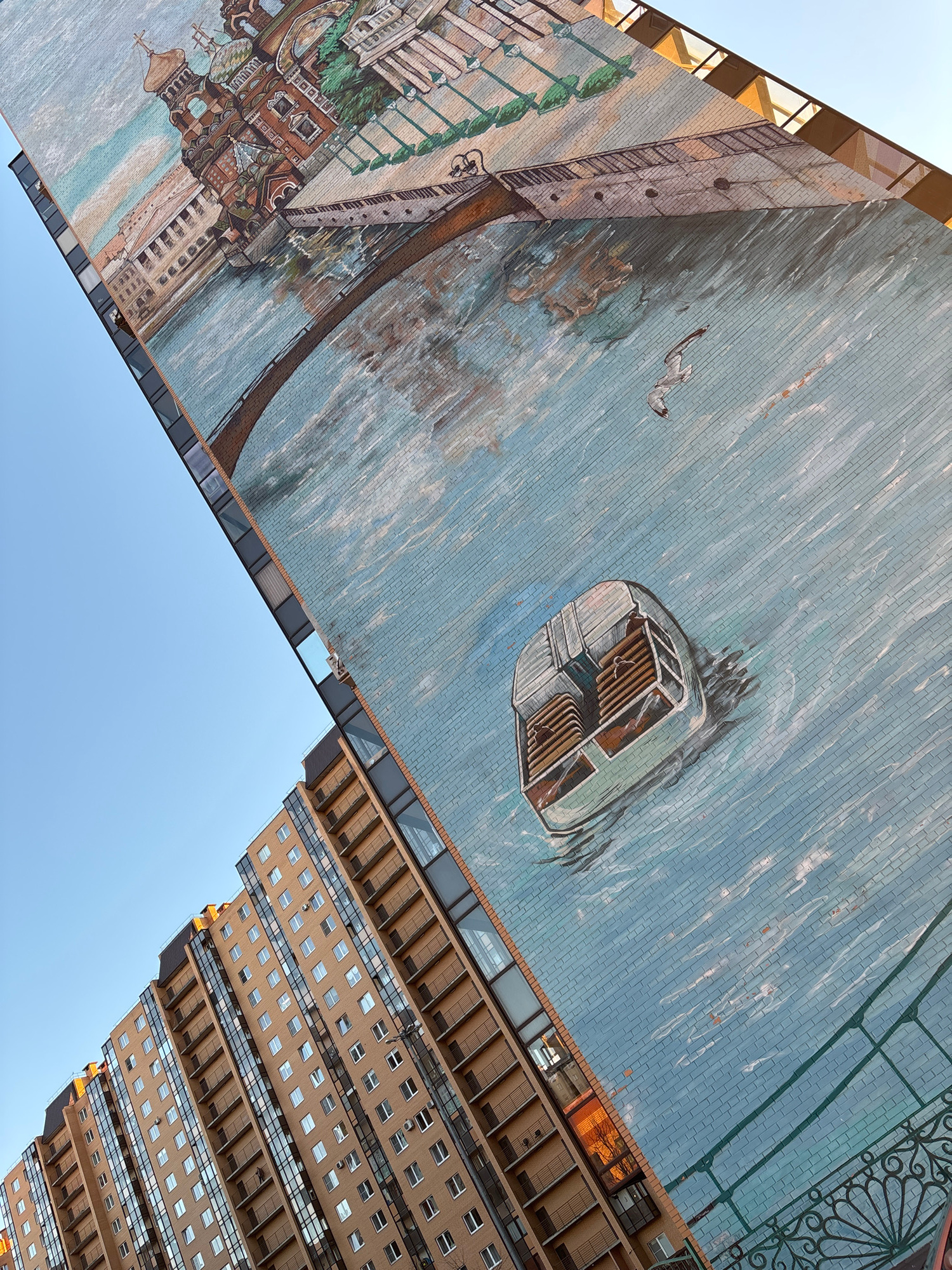 The image shows an unusual perspective of buildings in Kudrovo, Russia. A large mural depicting a cityscape with a river, bridge, and a cable car is juxtaposed with a modern apartment building, both a…read more