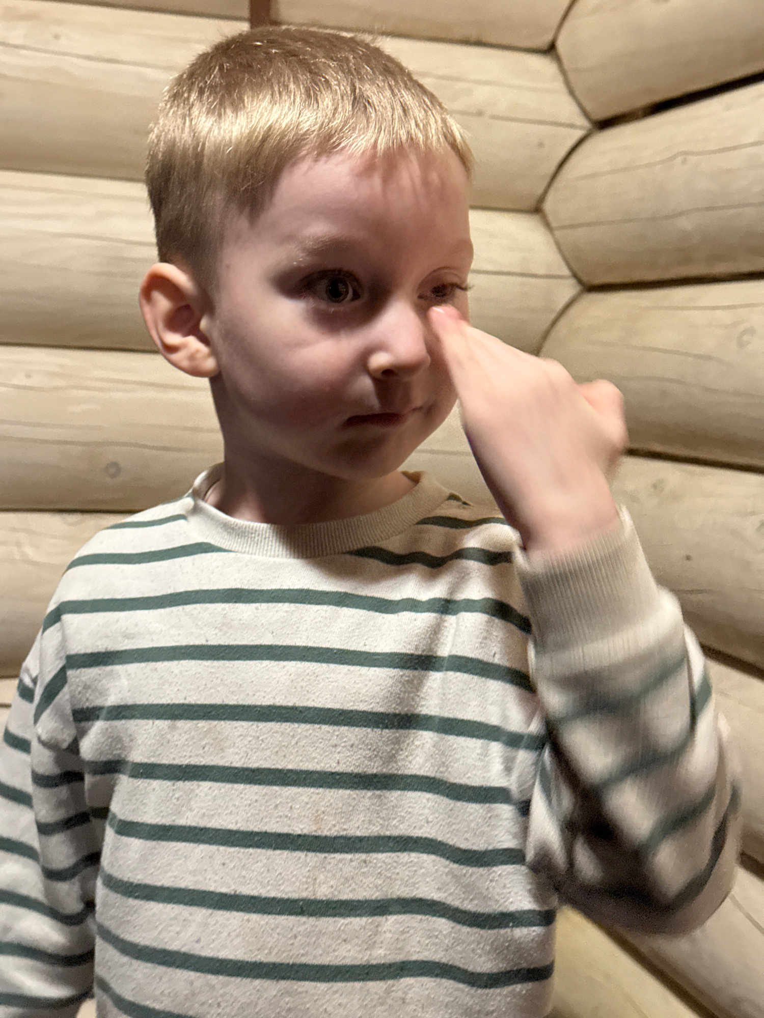 A fair-skinned child with short blonde hair is seen in a close-up shot. The child is wearing a striped, long-sleeved shirt with a round neckline. The stripes appear to be a faded green on a lighter ba…read more