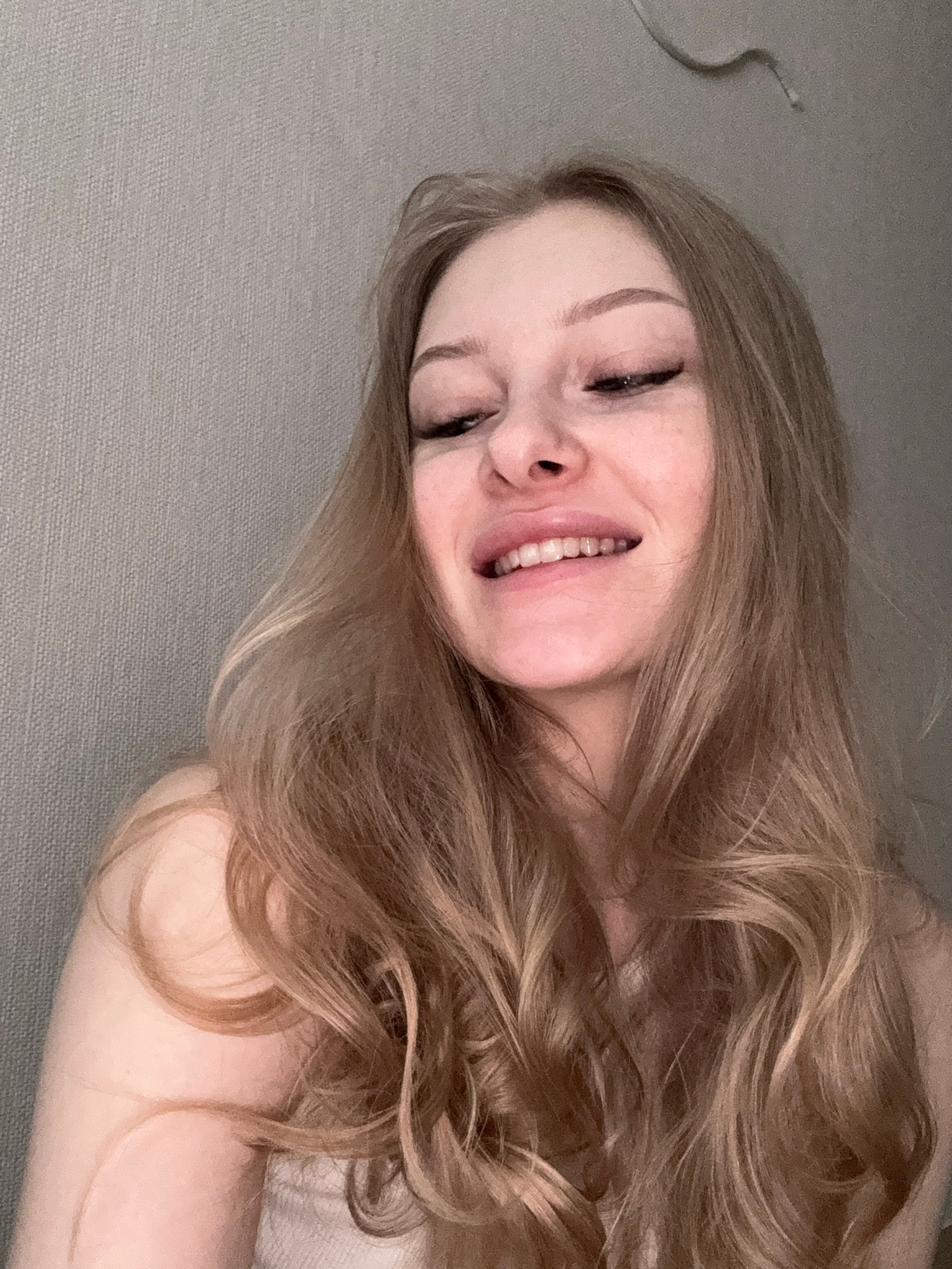 A woman with long, wavy, light brown hair is lying on a grey surface, possibly a bed or couch. She is smiling broadly, with her eyes partially closed. The background is a plain grey texture. The settiβ¦read more