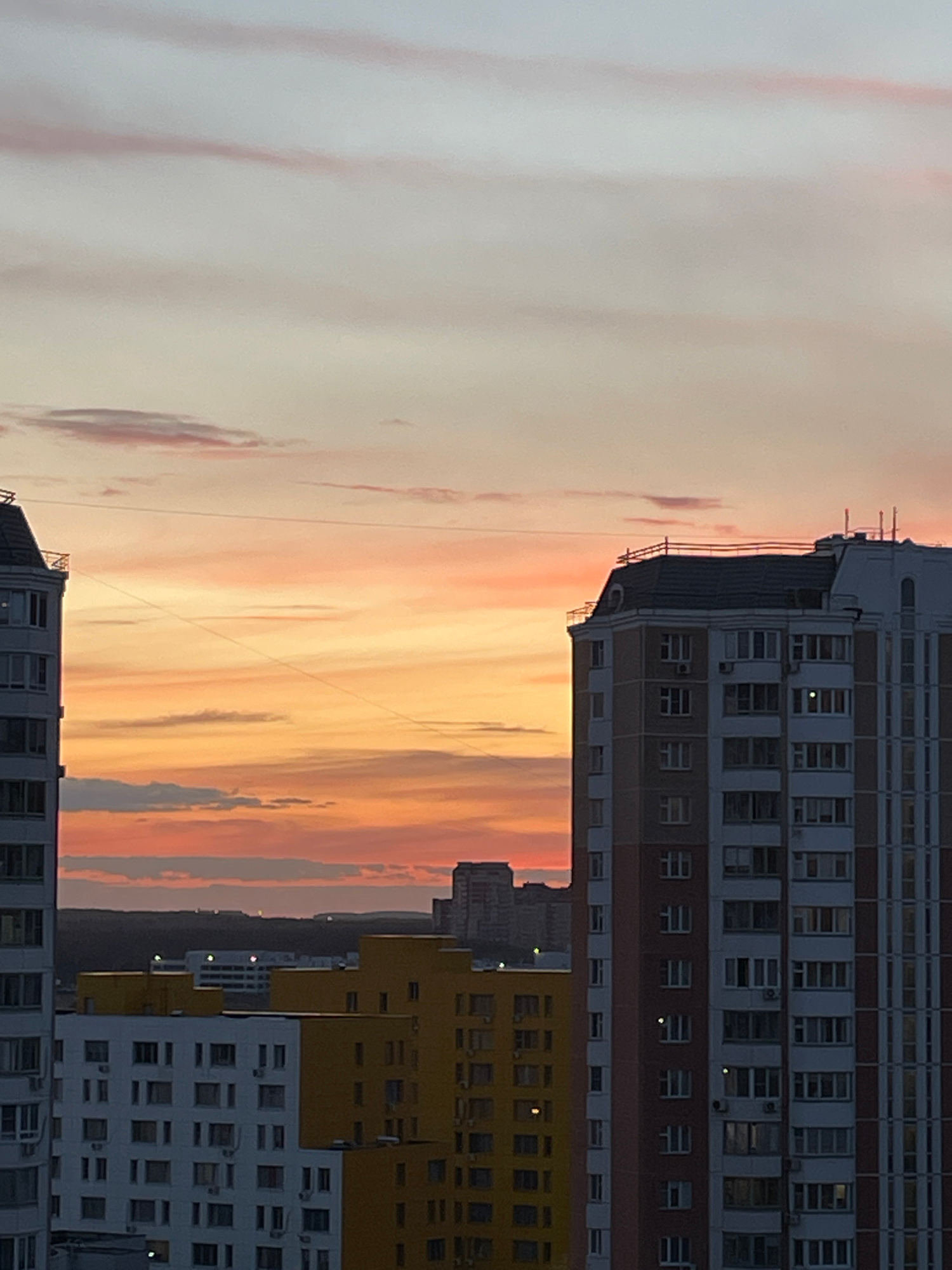 The image shows a view of buildings in Moskovskiy, Russia, at sunset. The sky is filled with pink, orange, and gray hues. In the foreground are several high-rise apartment buildings of varying heights…read more