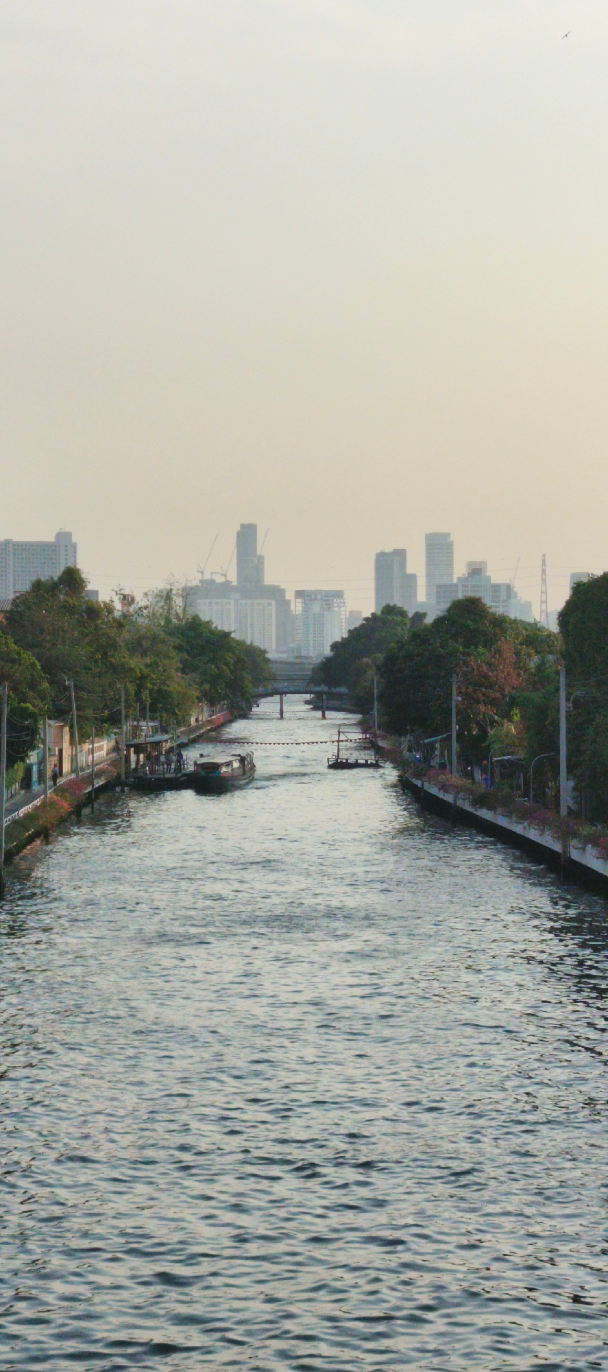 The image presents a vertical view of an urban canal in Bangkok, Thailand, extending into the distance under a hazy sky. The canal, filled with rippled water, dominates the lower and central parts ofโฆread more