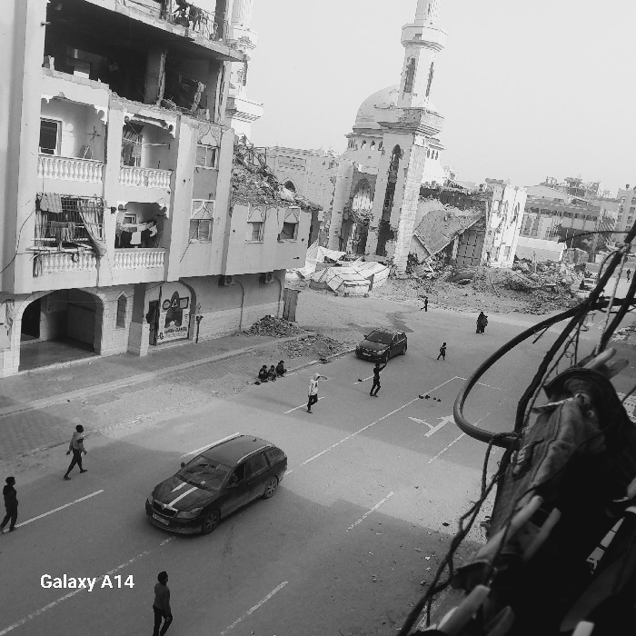 The image depicts a severely damaged urban street scene in Khan Yunis, Palestinian Territory, rendered in black and white. In the foreground to the left, a multi-story building, likely residential, ex…read more