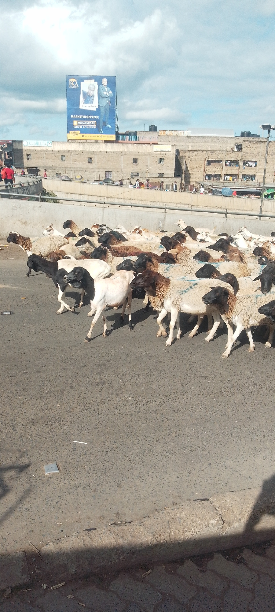 A herd of sheep crosses a paved city street in Nairobi, Kenya. The animals are predominantly white, tan, and black. An overpass is in the background. People are visible on the overpass. A billboard is…read more