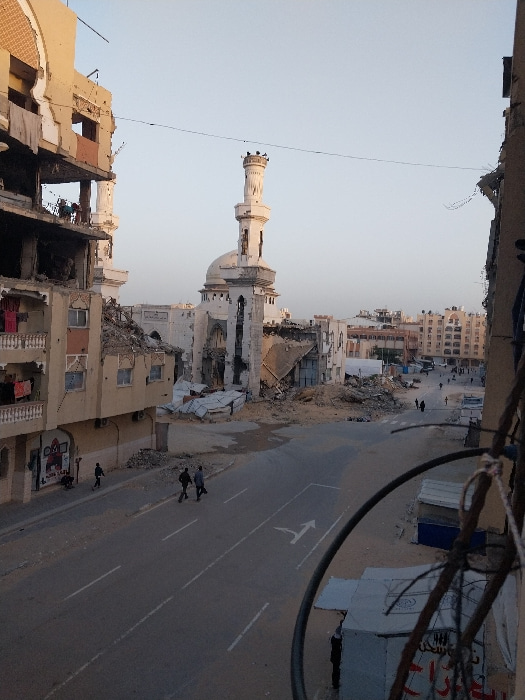 The image shows a scene of destruction in an urban environment. A mosque's minaret stands relatively intact amidst heavily damaged buildings. The street is clear but littered with debris. Several figu…read more
