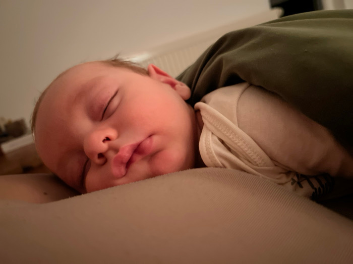 A sleeping baby lies nestled on someone's chest, covered partially by a dark green blanket. The baby is wearing a light-colored onesie. The baby's eyes are closed, and lips are slightly parted. The ba…read more