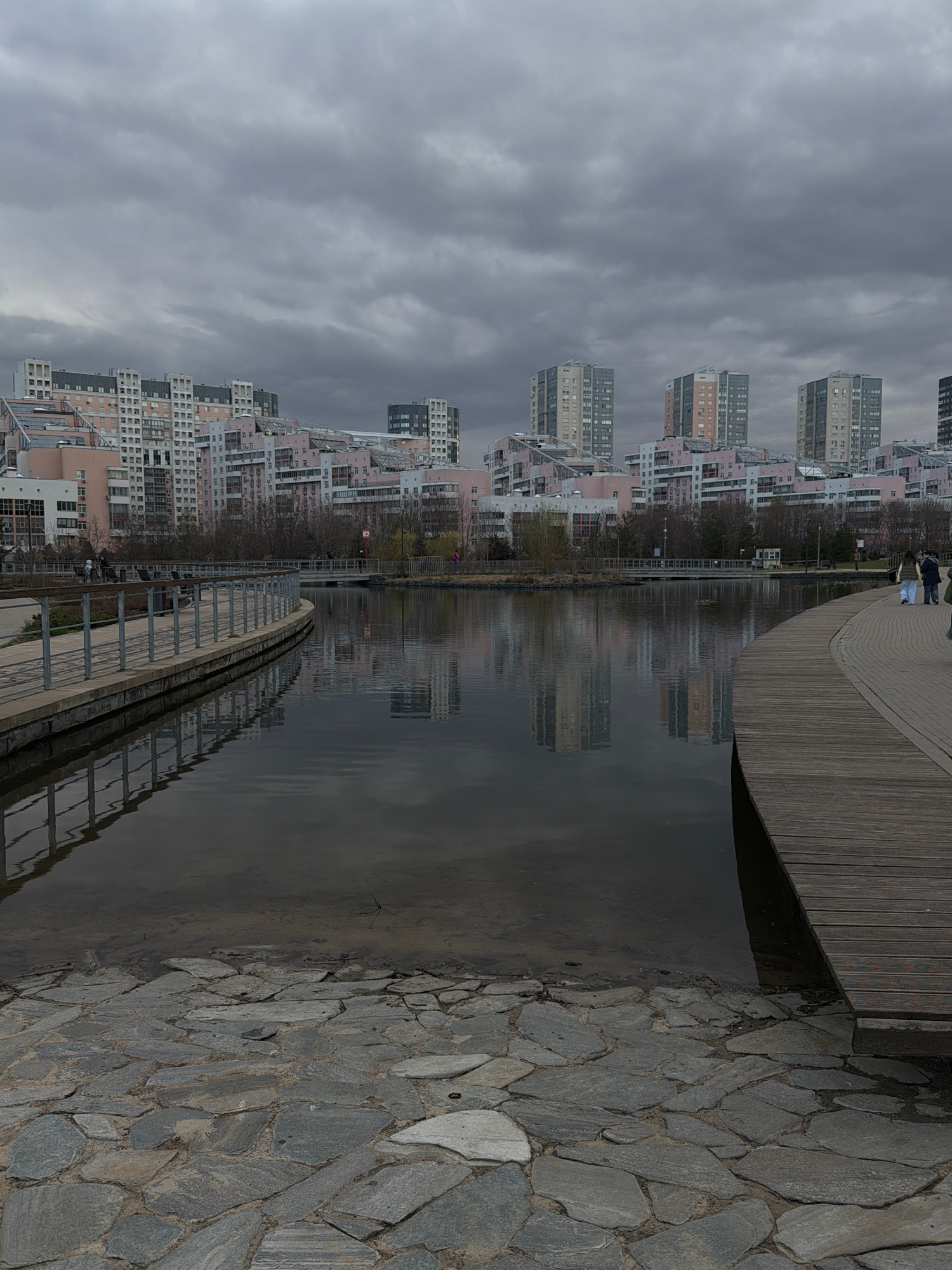 The image depicts a view of Khimki, Russia, likely taken near the Moscow Canal. The city's residential buildings, primarily high-rise apartments with light-colored facades, are visible in the background. These buildings are reflected in a body of water, possibly a canal or a lake connected to the Moscow Canal. Along the water's edge, there is a paved area with wooden decking and stone tiles. The sky is overcast with grey clouds, indicating a cloudy day. Few individuals are seen in the image, likely walking along the wooden decking. A metal railing is visible along the water's edge. | Open Wire
