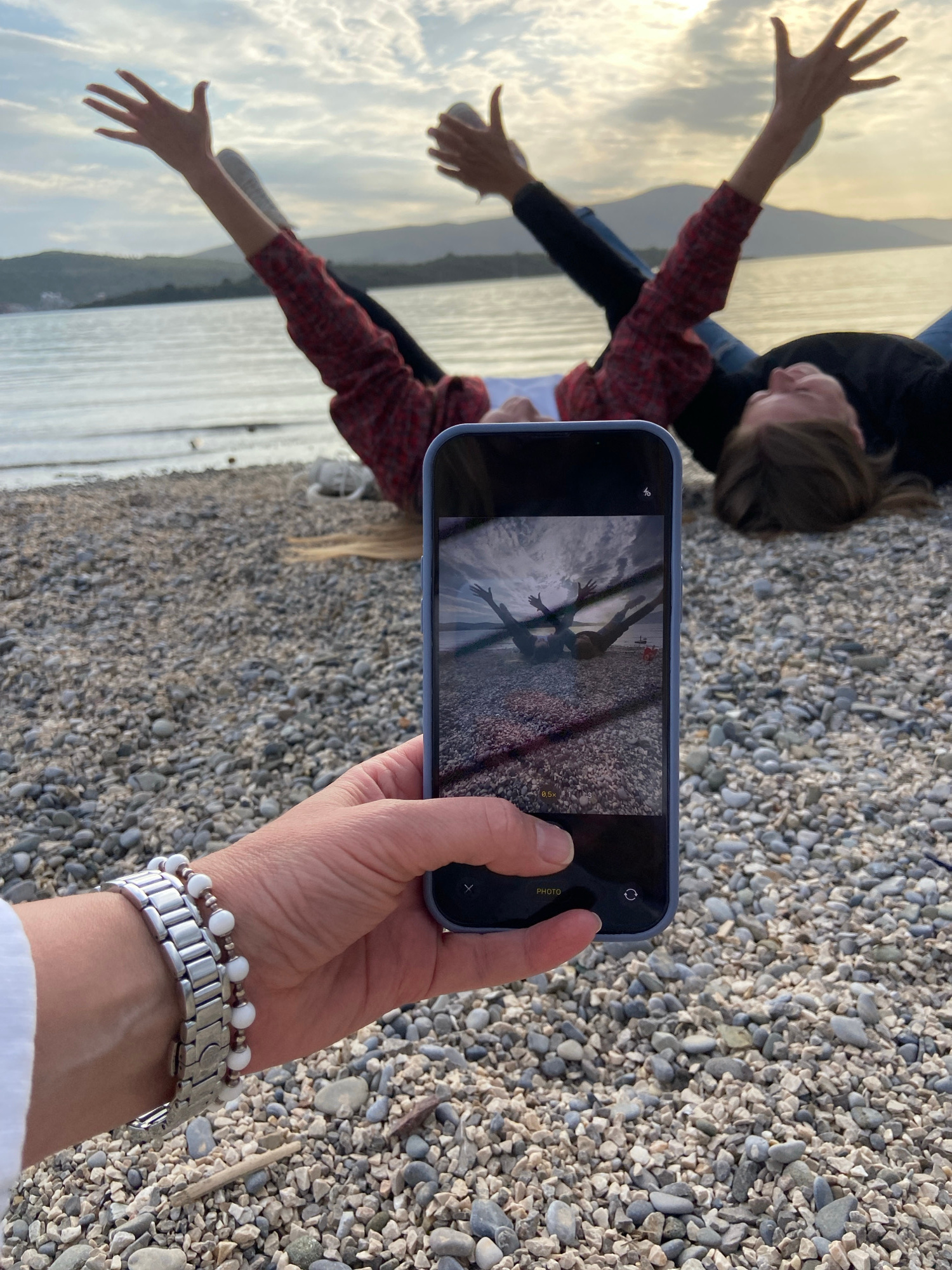 A person in a red and black plaid shirt lies on a pebble beach with arms outstretched towards the water, appearing to be photographed with a smartphone. The smartphone is held by another person, displ…read more