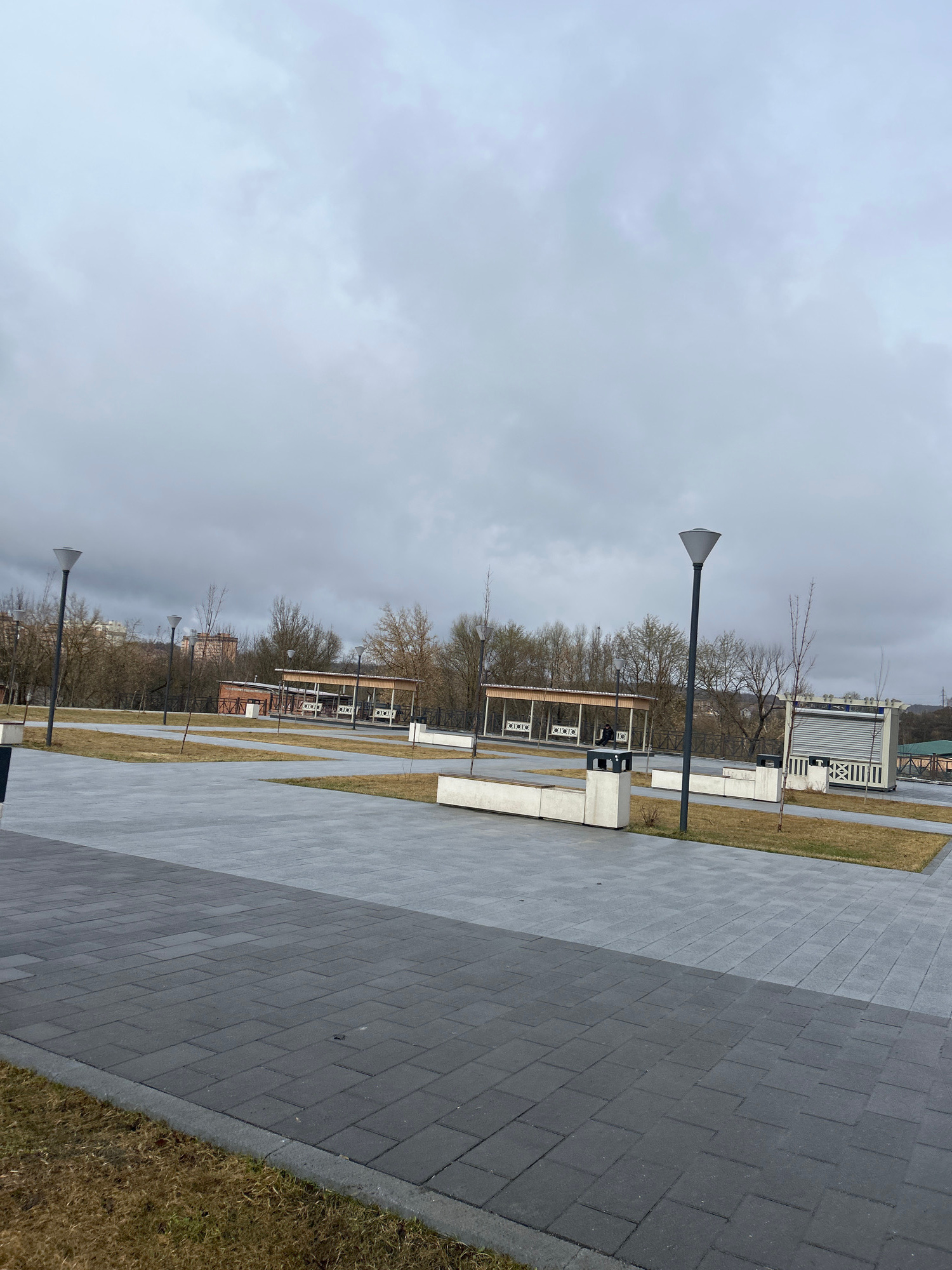 The image depicts a paved walkway in Klin, Russia, under a cloudy sky. The walkway is constructed of gray rectangular pavers, with two distinct shades. To the right of the walkway is a strip of dry gr…read more