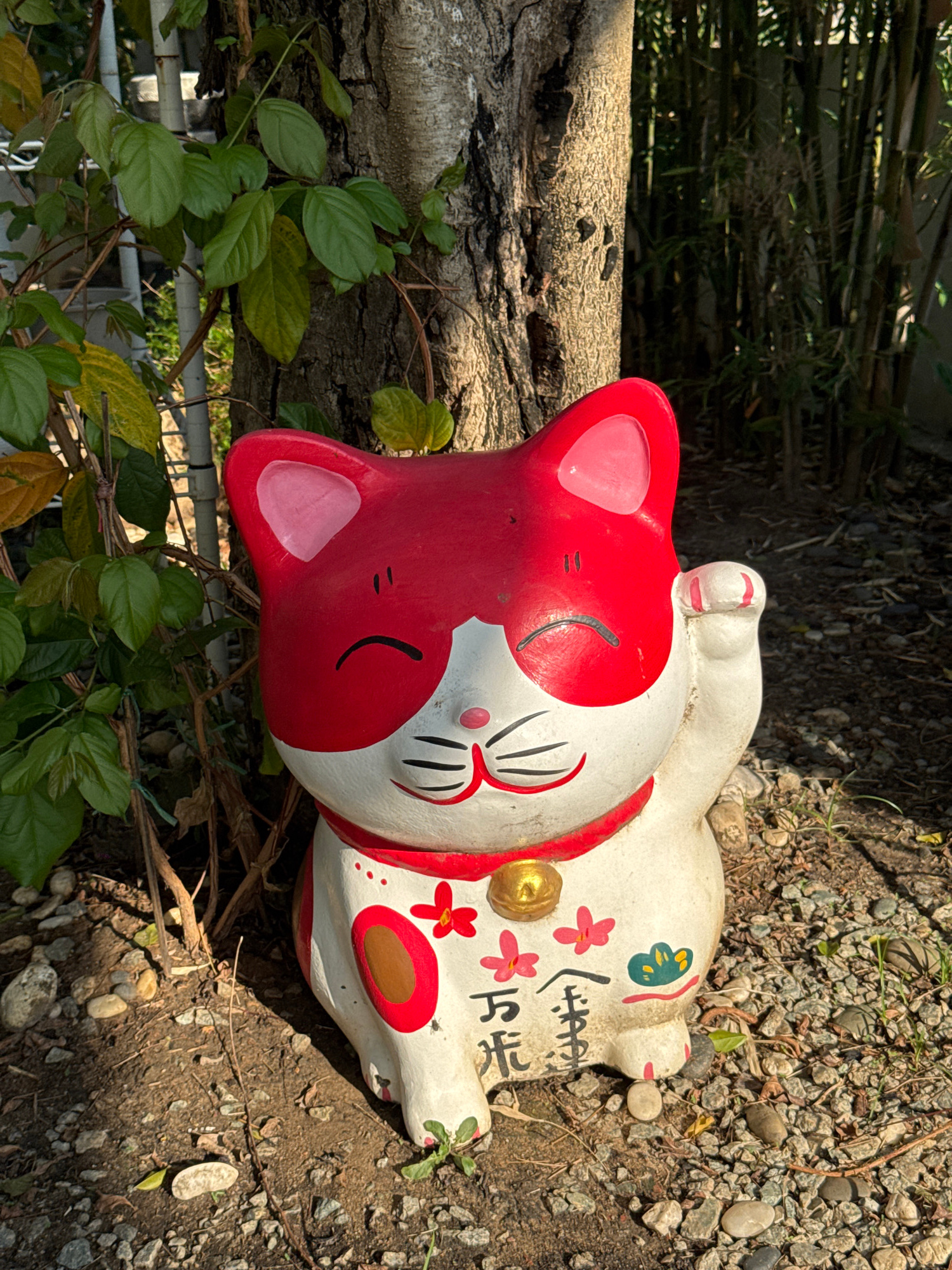 A ceramic Maneki Neko figurine rests on its side on a bed of small rocks and dirt in what appears to be an outdoor garden setting. The cat has a red head and a white body with red and green decorative…read more