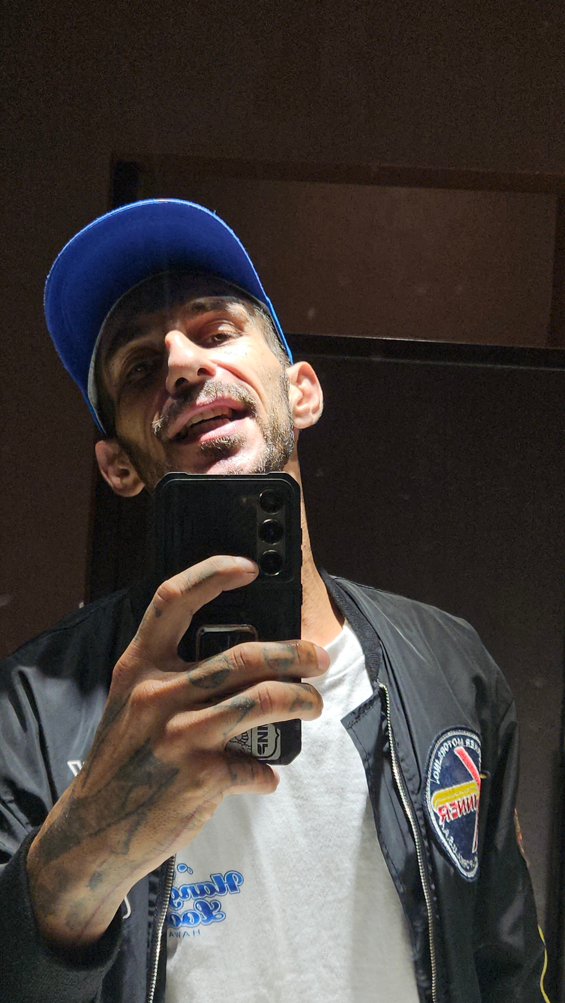 A man with light brown skin, a beard, and a blue baseball cap is taking a selfie in a mirror. He's holding a black smartphone with a triple-lens camera setup. His left hand is visible and covered in t…read more