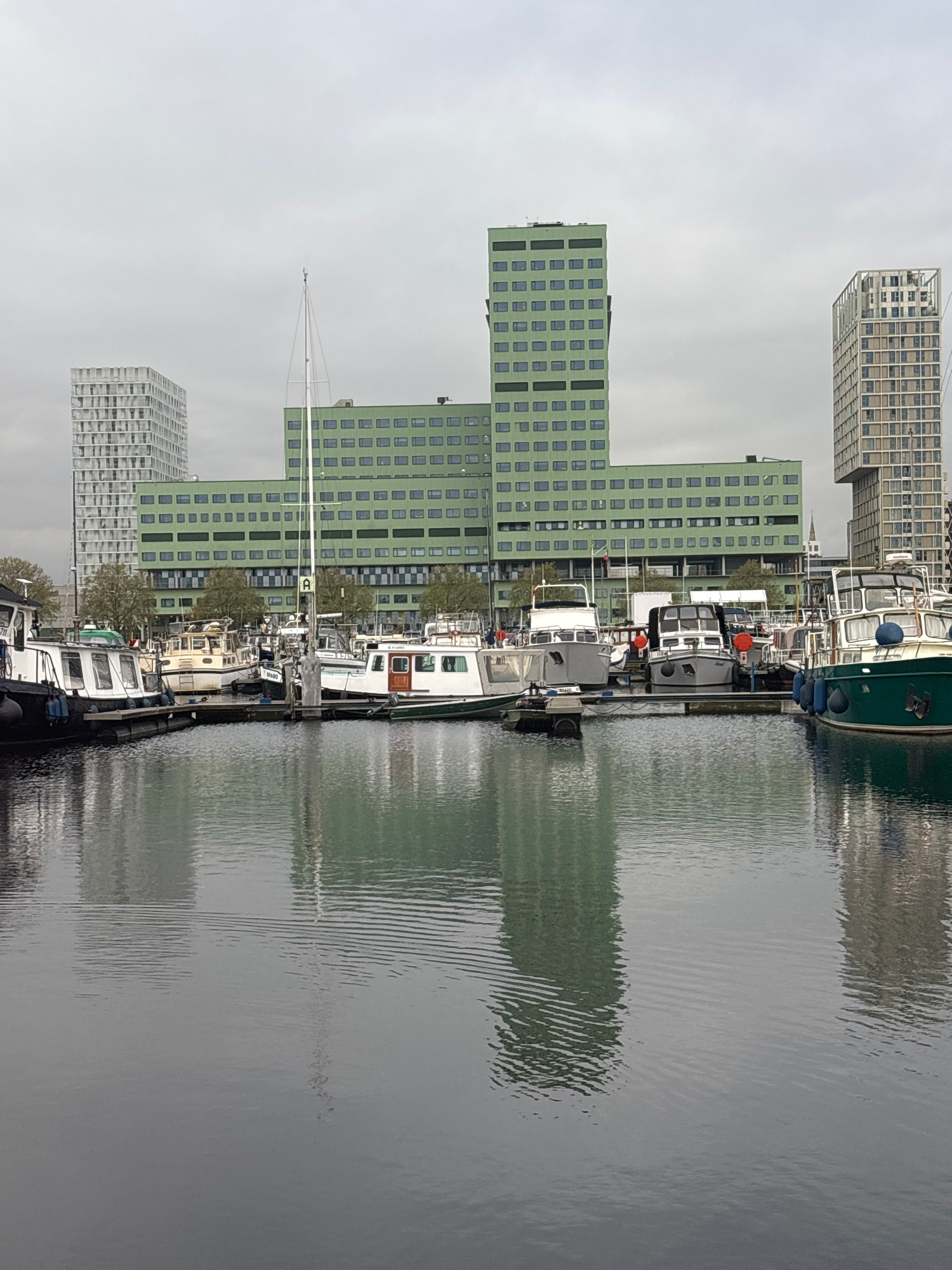The image depicts a cityscape on a cloudy day in Antwerp, Belgium, reflected in calm water. Prominent are modern, high-rise buildings with rectangular windows, colored in hues of green and white. Adja…read more