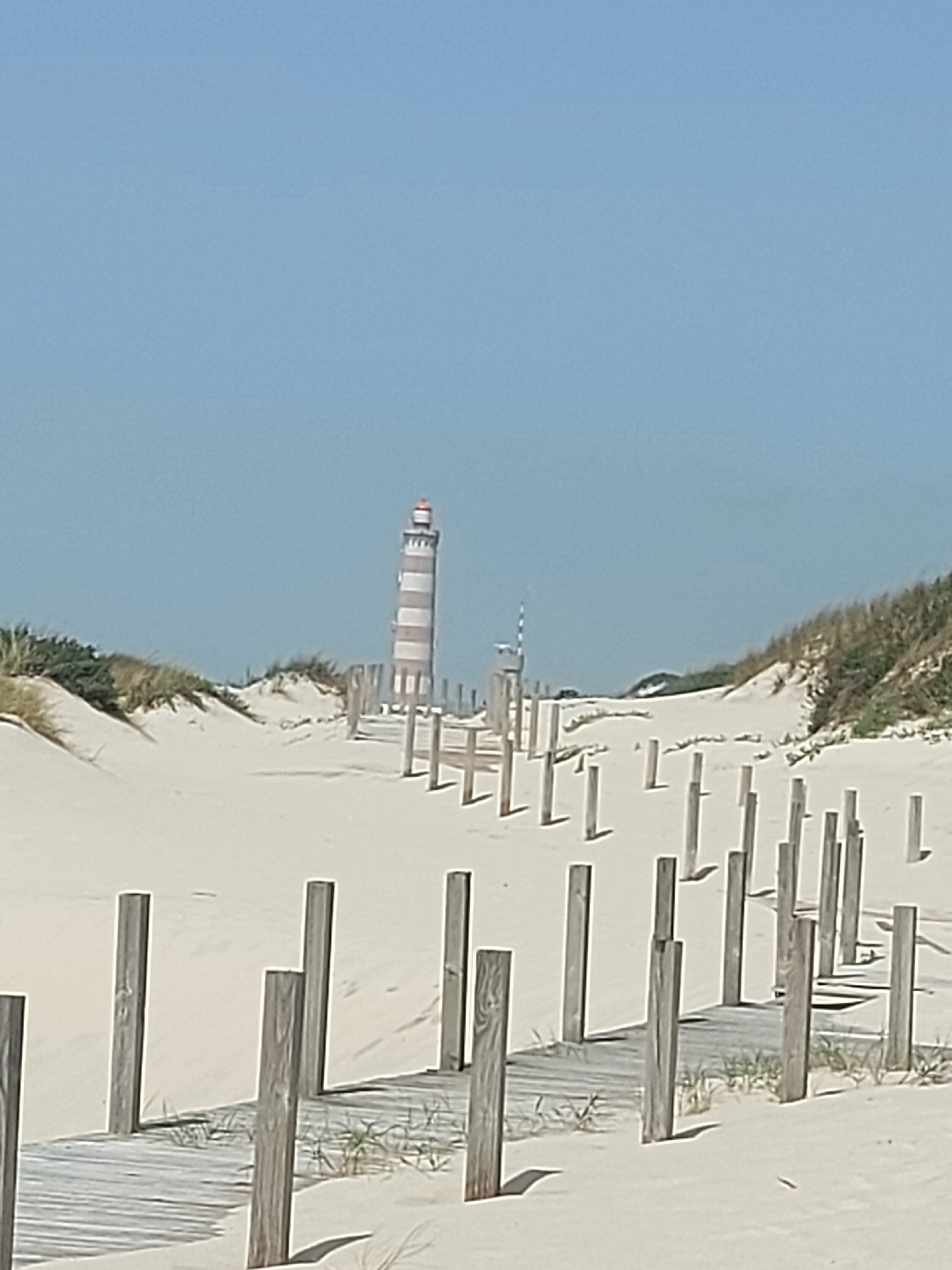 The image shows a beach scene in Gafanha da Nazaré, Portugal. A striped lighthouse stands in the distance, visible against a clear blue sky. The foreground features a sandy beach with wooden boardwalk…read more