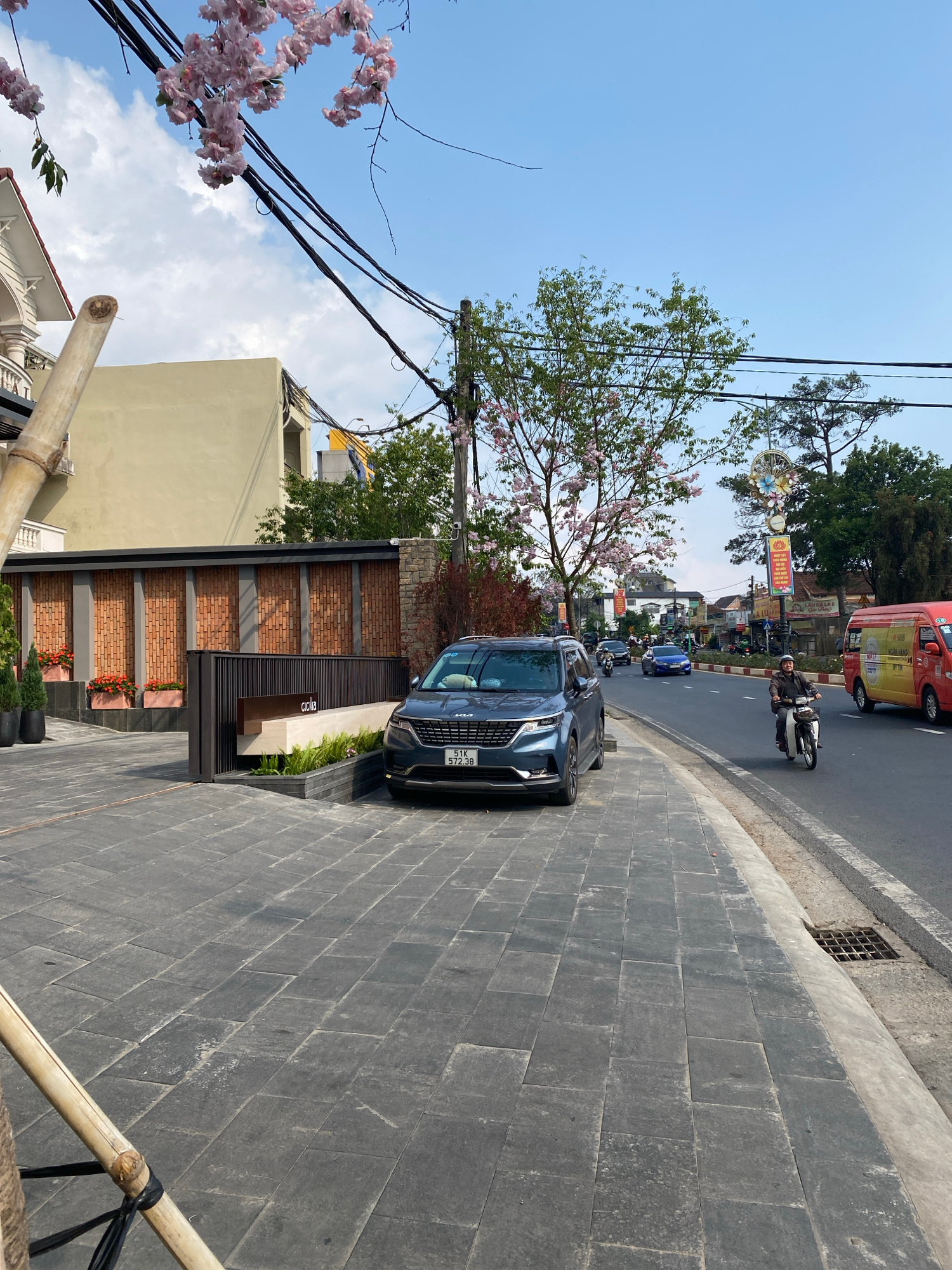 The image depicts a street scene in Da Lat, Vietnam. A dark blue SUV is parked on a tiled sidewalk next to a building with a brick facade and a black metal frame. The license plate of the SUV is visibβ¦read more