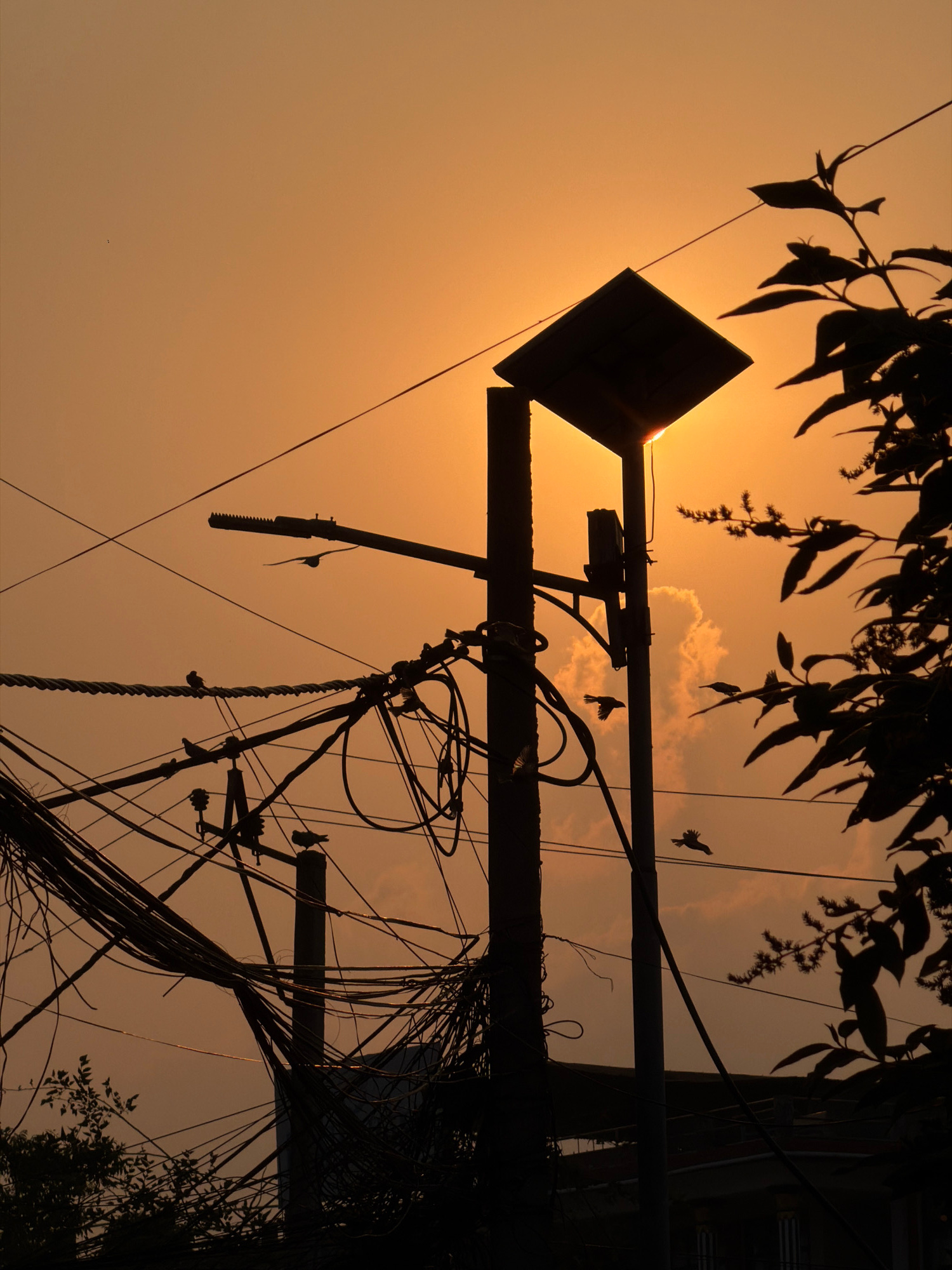 Captured in Kathmandu Metropolitan City, Nepal, the image showcases a silhouette of utility poles and power lines against a backdrop of a sunset or sunrise. The sky is a gradient of orange and yellow,…read more