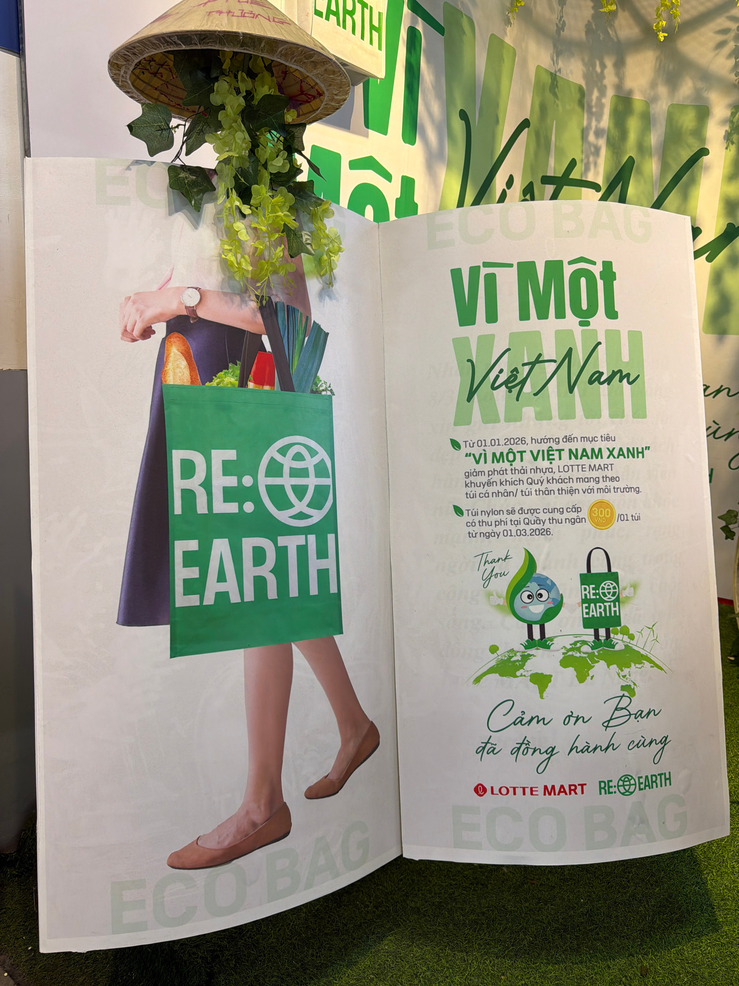 The image is a close-up shot of an open brochure or poster featuring environmental and sustainability messages, presumably from LOTTE MART. The brochure is entitled "Vì Một Việt Nam Xanh," which trans…read more