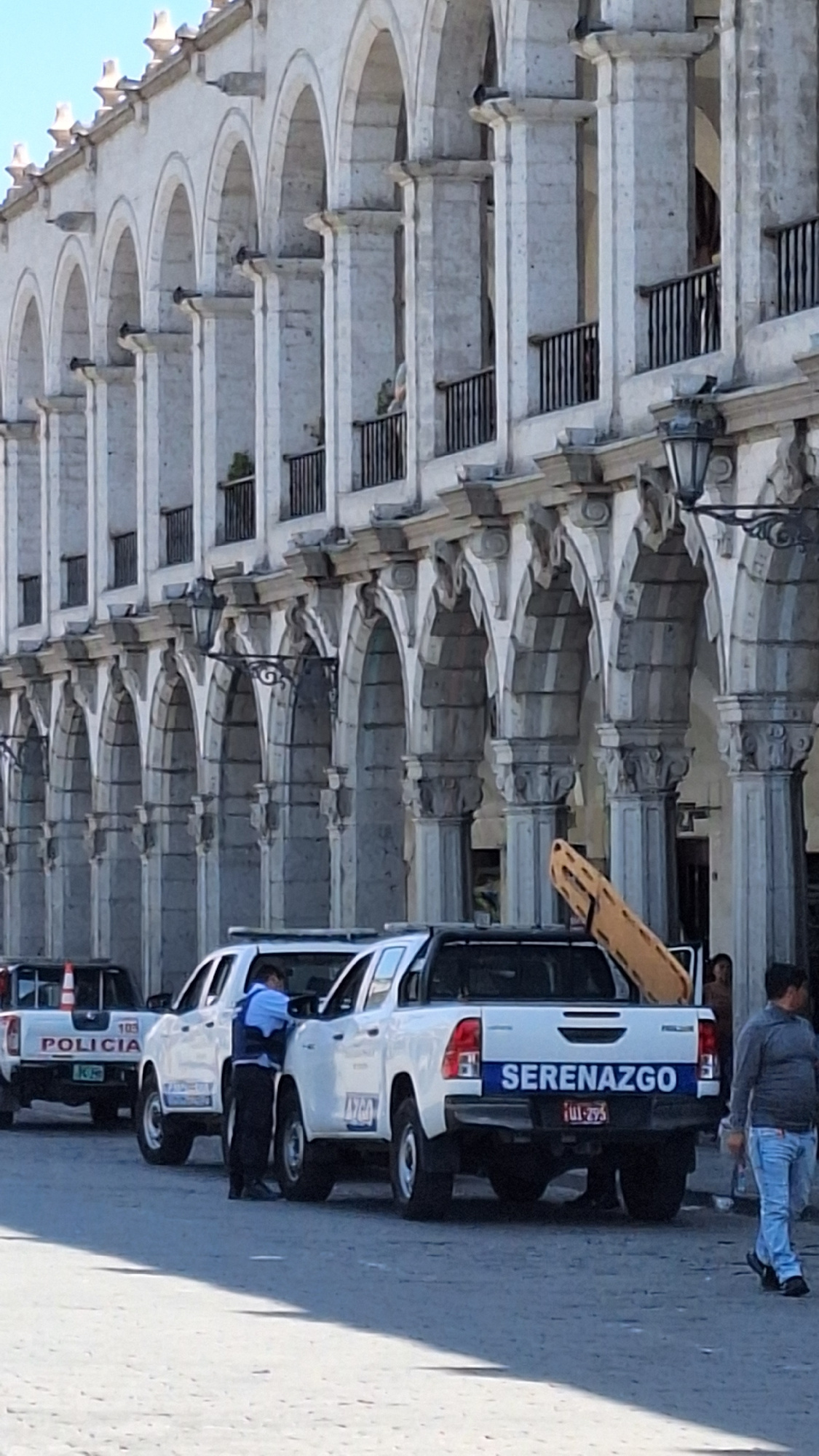 The image captures a row of parked vehicles labeled "Serenazgo" and "Policia" (Police) in front of a building with colonial architecture, characterized by arches and stone construction. This location…read more