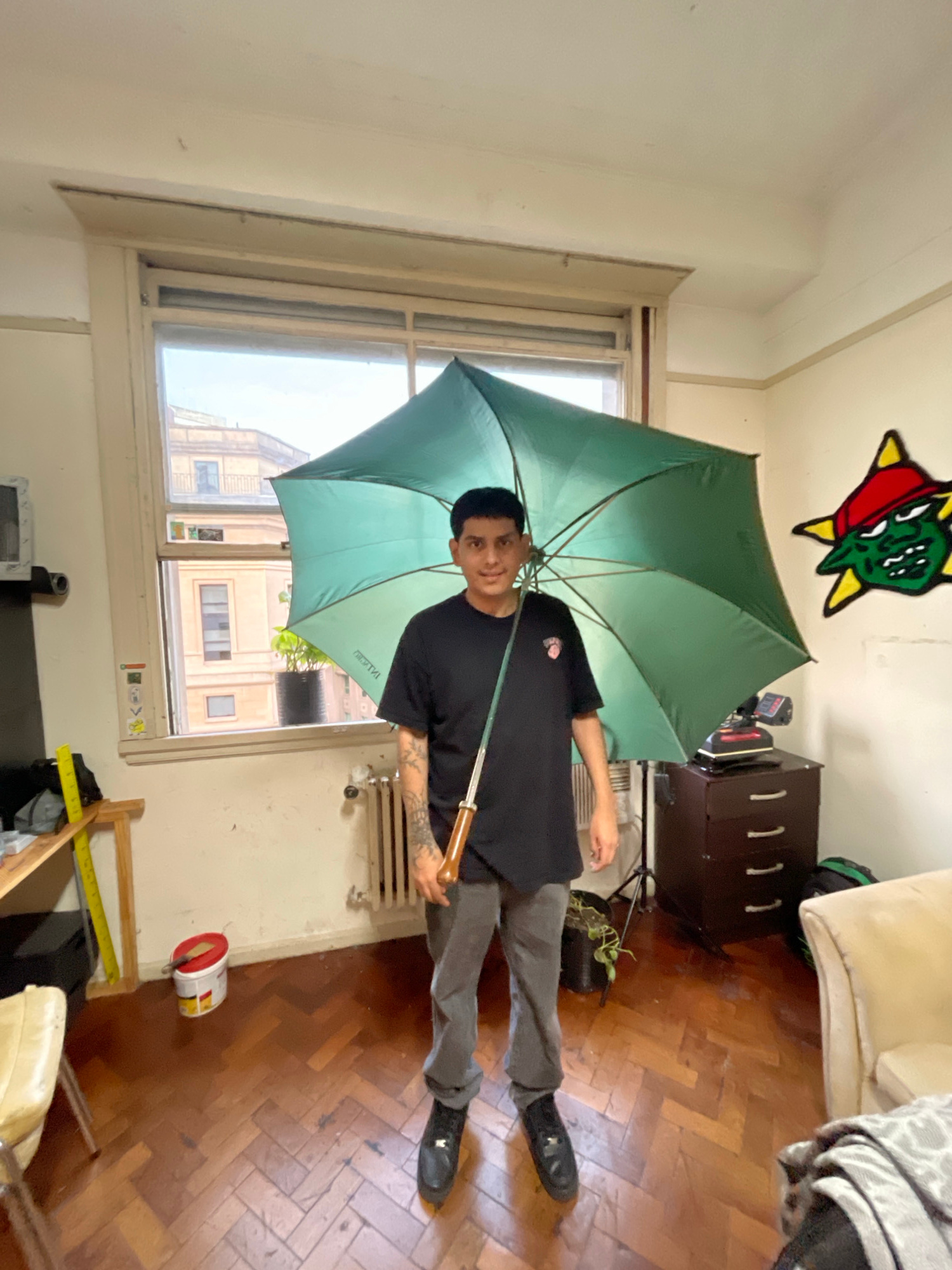 A man stands in an indoor space holding an open green umbrella. He is wearing a black t-shirt, grey pants, and black shoes. He has short, dark hair and visible tattoos on his left arm. Behind him is a…read more