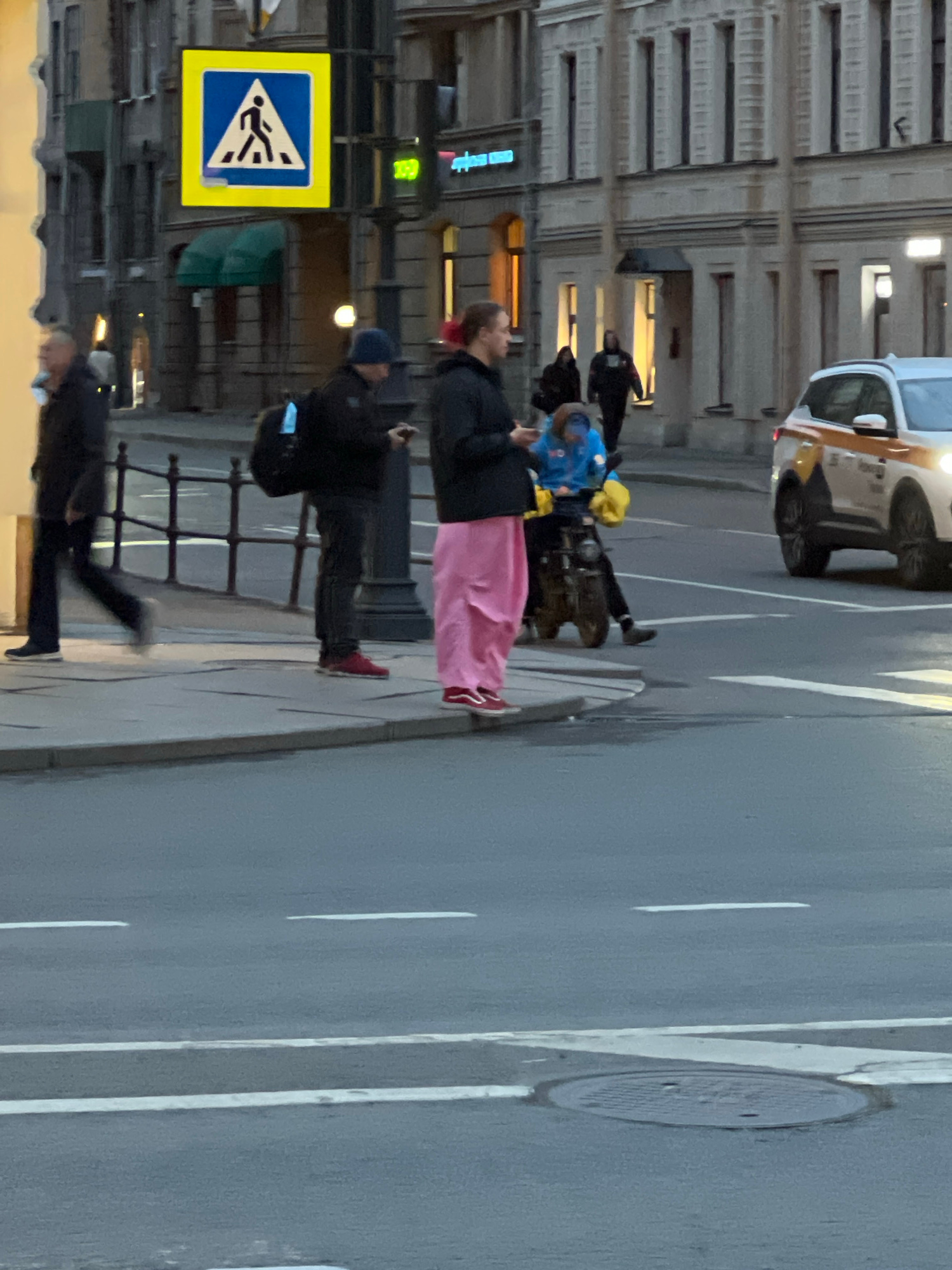 A pedestrian crosswalk in Saint Petersburg, Russia is indicated by a yellow and blue sign on a lamppost. Pedestrians, including a woman wearing a pink skirt, are waiting to cross. A vehicle is stoppedโ€ฆread more