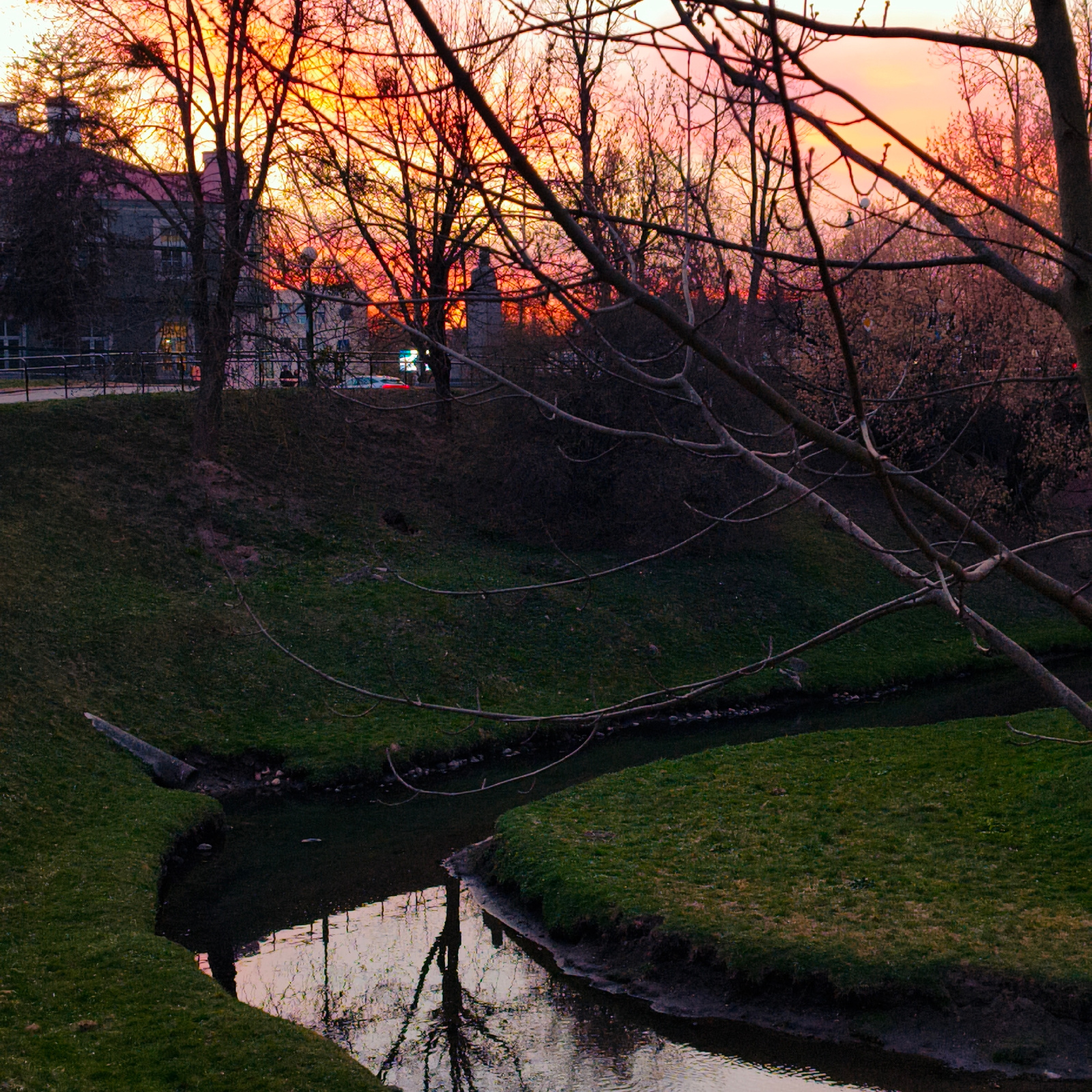 The image captures a scene at dusk in Hrodna, Belarus, featuring a narrow stream winding through a grassy area. Bare trees and branches frame a dramatic orange and pink sunset sky in the background. O…read more