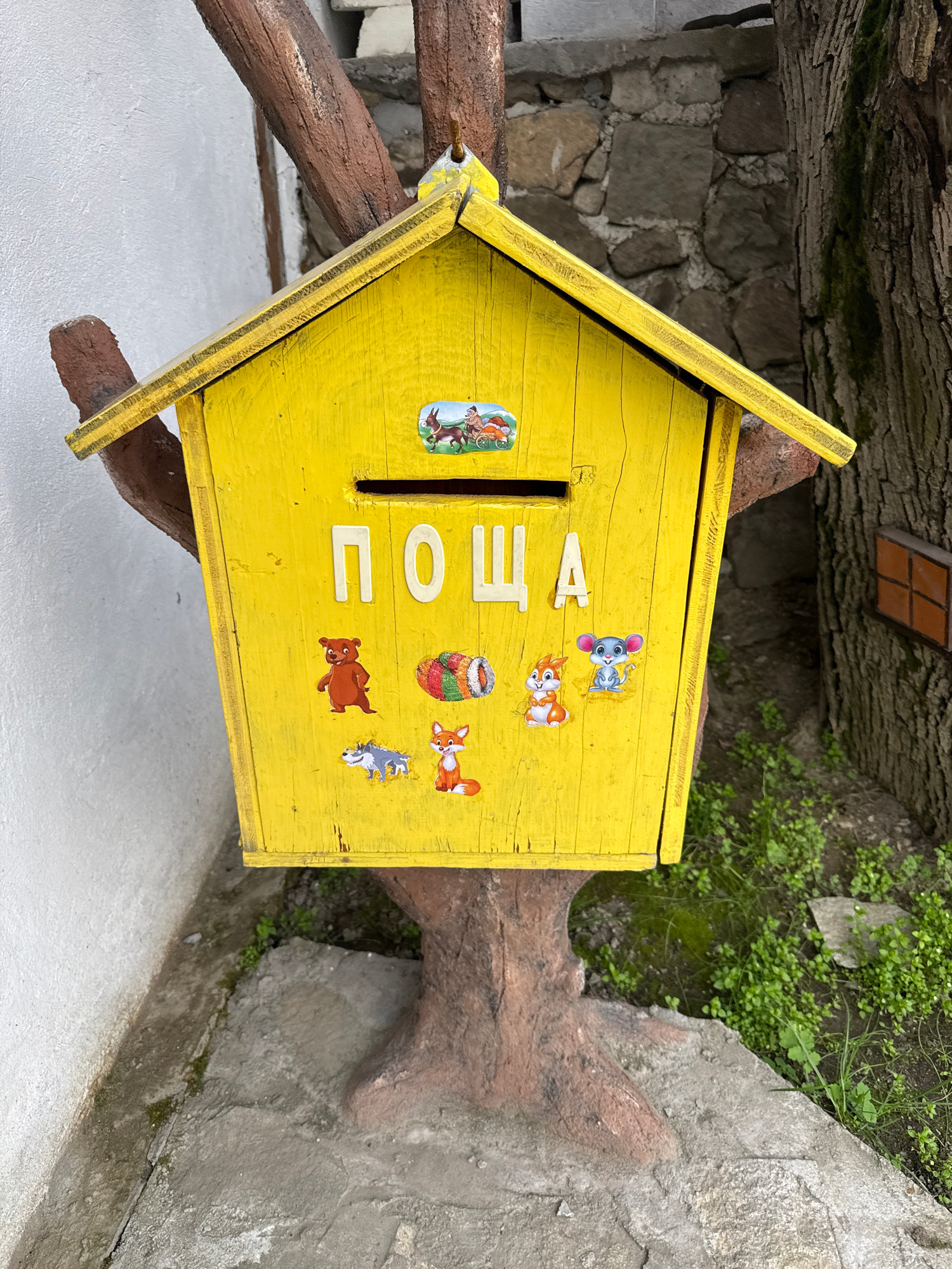 A yellow mailbox, decorated with animal stickers and the word "ПОЩА" (mail), is mounted on a brown, artificial tree branch. The background consists of stone walls, some greenery, and what appears to b…read more