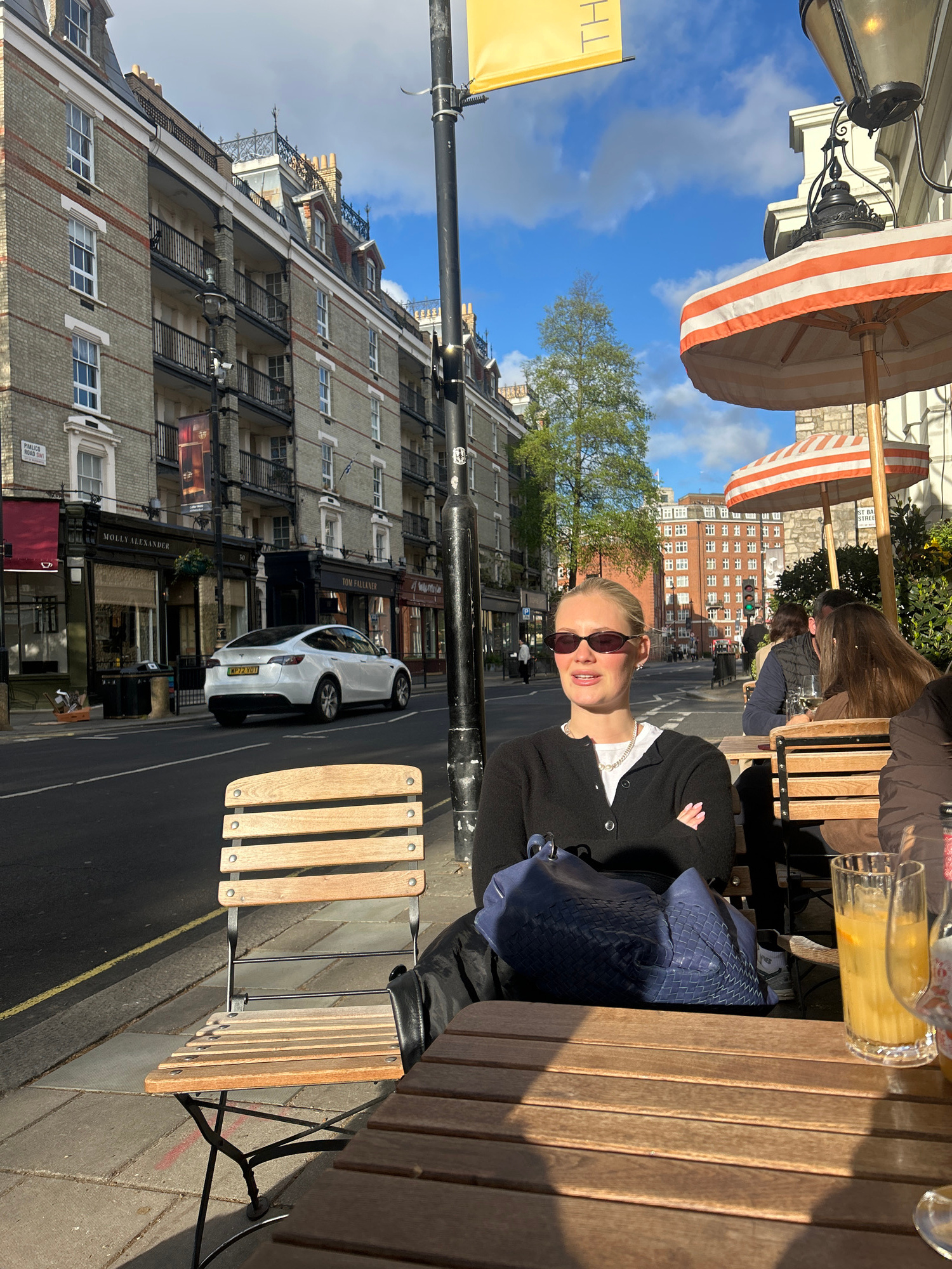 The image captures a scene on a street in London, United Kingdom. In the foreground, a young woman with blonde hair, wearing sunglasses, a white shirt with a pearl necklace, and a black cardigan, sits…read more