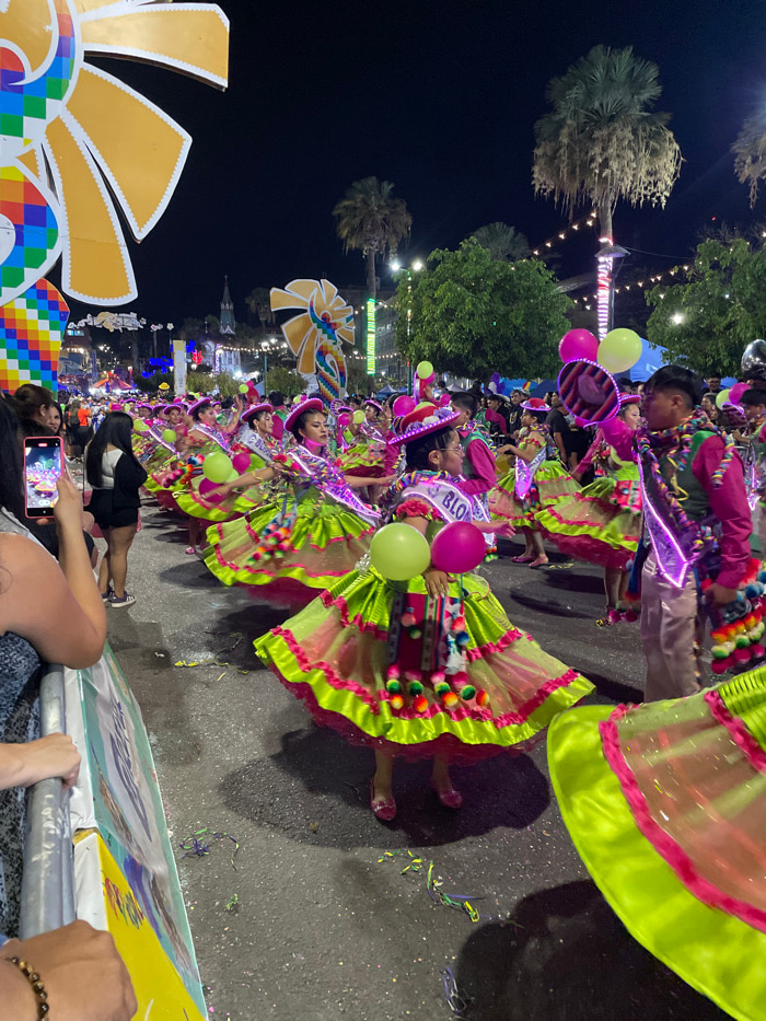 A lively parade scene at night, with dancers in vibrant, multi-colored dresses adorned with pom-poms and neon trims. The dancers carry balloons and wear hats, some with "BLO" sashes. Streetlights and…read more