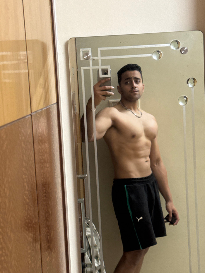 A shirtless man takes a mirror selfie. He has short dark hair, dark eyes, and is wearing a silver necklace and black athletic shorts. His physique is toned. The mirror is rectangular with decorative d…read more