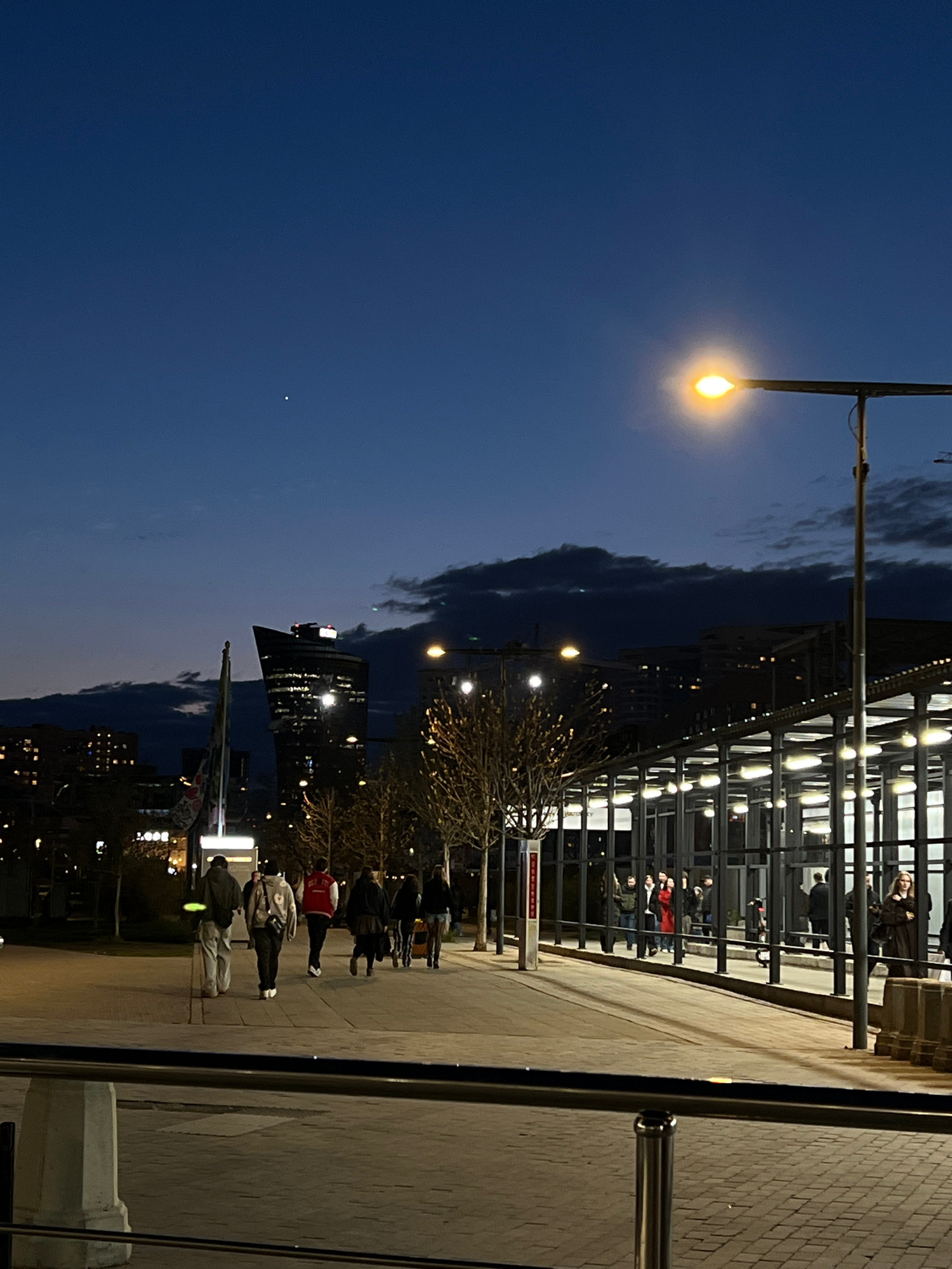 The image shows an evening scene in Khimki, Russia. People are walking along a paved walkway next to a modern building with glass walls and a steel frame. There is a streetlight casting a yellow glow.…read more