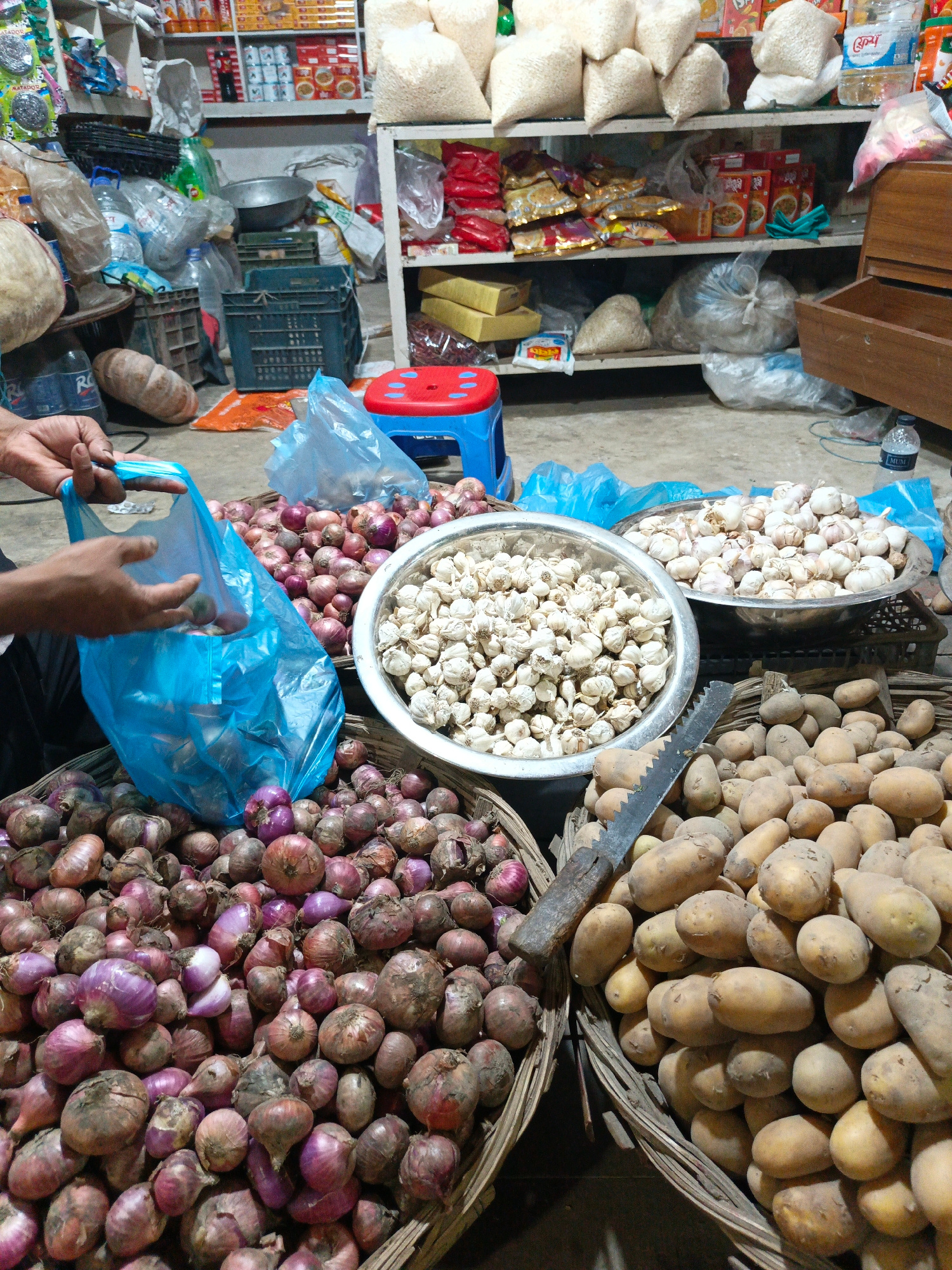 The image shows a vegetable stall in Dhaka, Bangladesh. There are several baskets and bowls filled with vegetables. In the foreground, there is a basket full of red onions and another basket full of p…read more