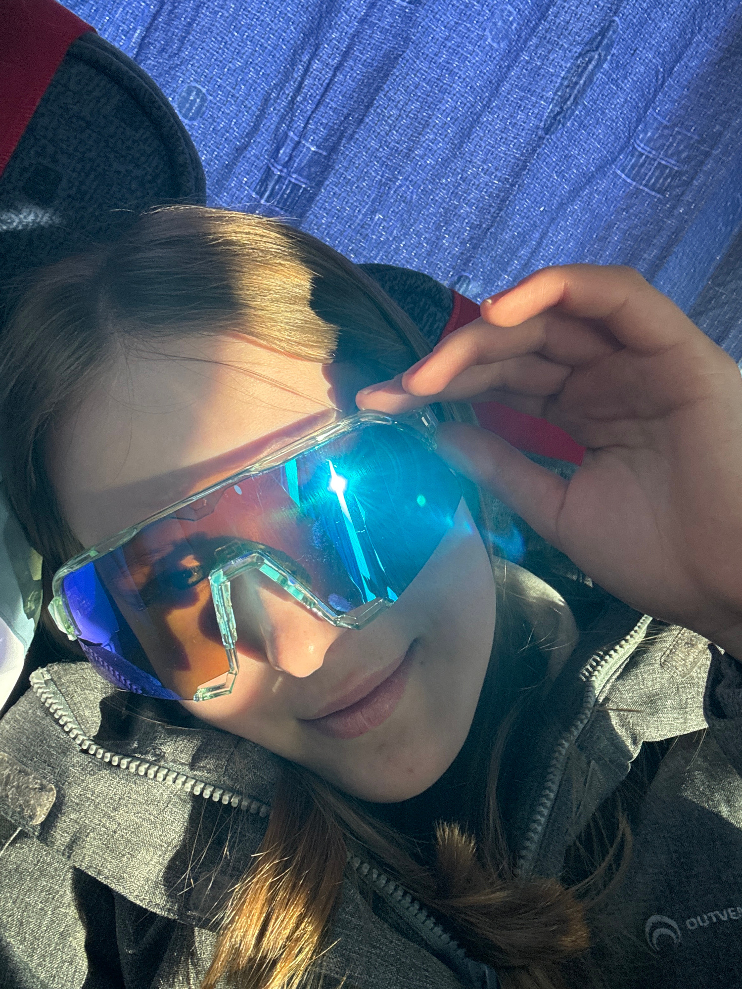 A person wearing sunglasses is depicted in a close-up, slightly angled shot. The sunglasses have blue lenses and a clear frame. The person's hand is visible, holding the glasses in place. The backgrou…read more