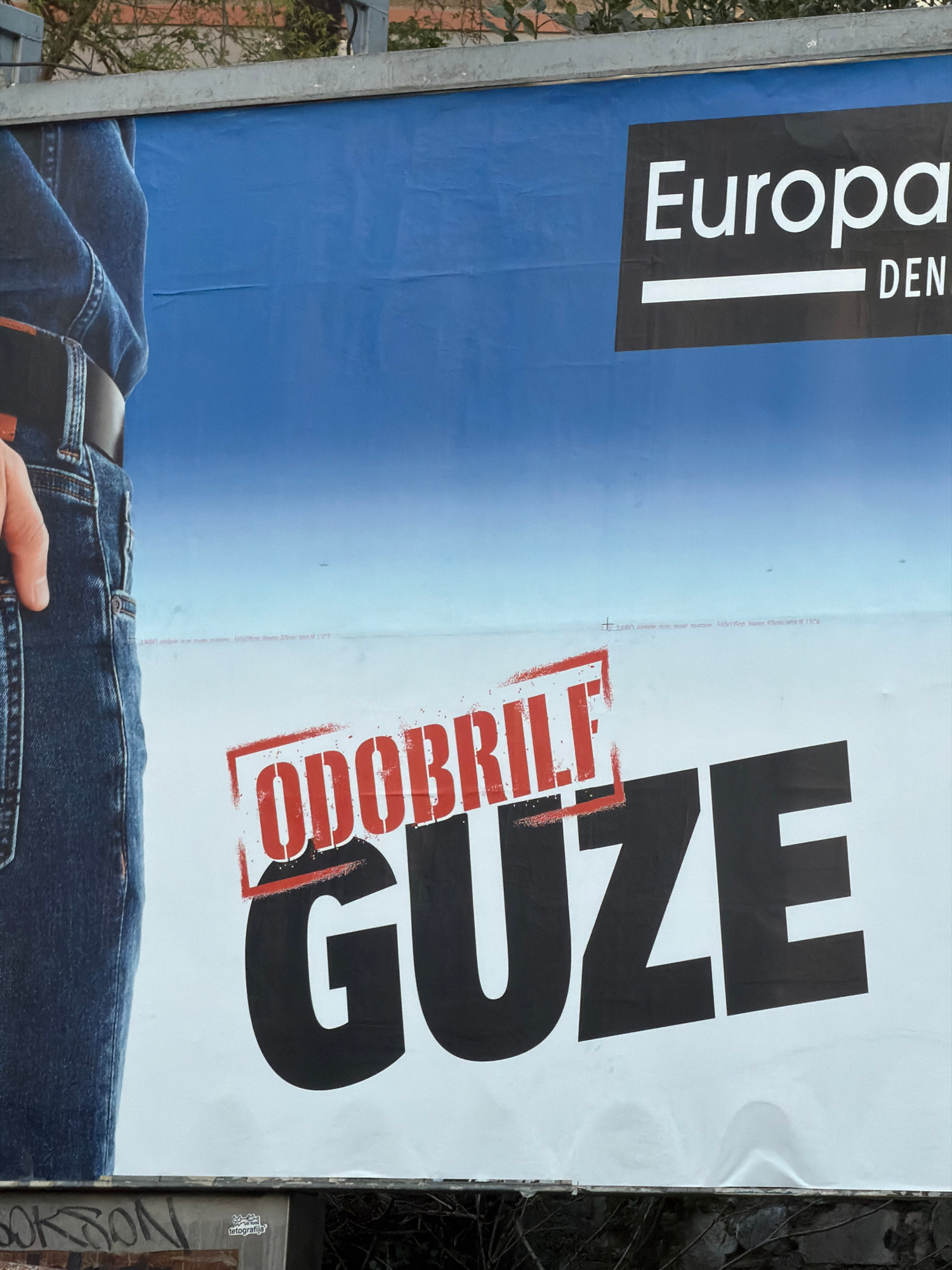 A photograph captures a slightly angled view of an outdoor advertisement, likely a poster, set in Grad Rijeka, Croatia. The advertisement features the words "Europa" and "DEN", with a blue gradient ba…read more