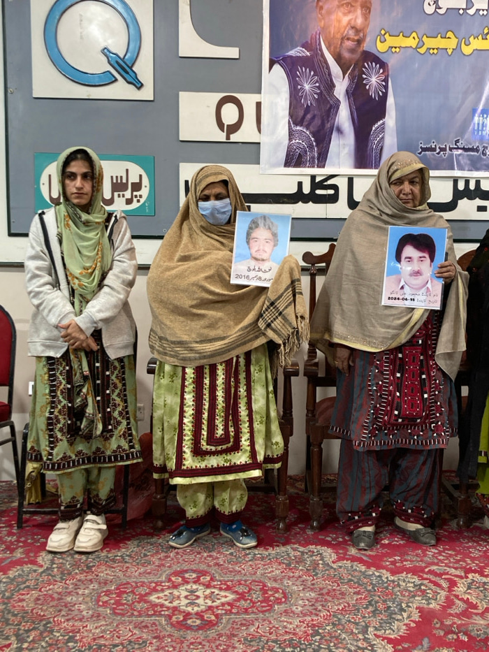 This image captures three women standing indoors on a patterned red carpet in Quetta City Tehsil, Pakistan. The background consists of a light-colored wall with several signs and banners. On the upper…read more