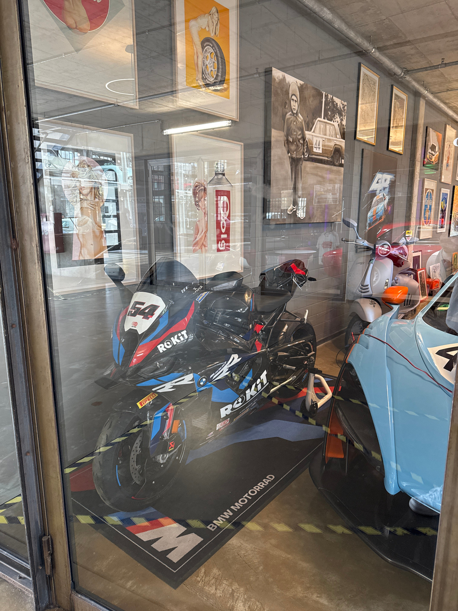 A display of vehicles and artwork is behind glass. Featured vehicles include a blue car with the number 4 on it and a black BMW motorcycle, both appearing to be modern race vehicles. A white moped is…read more