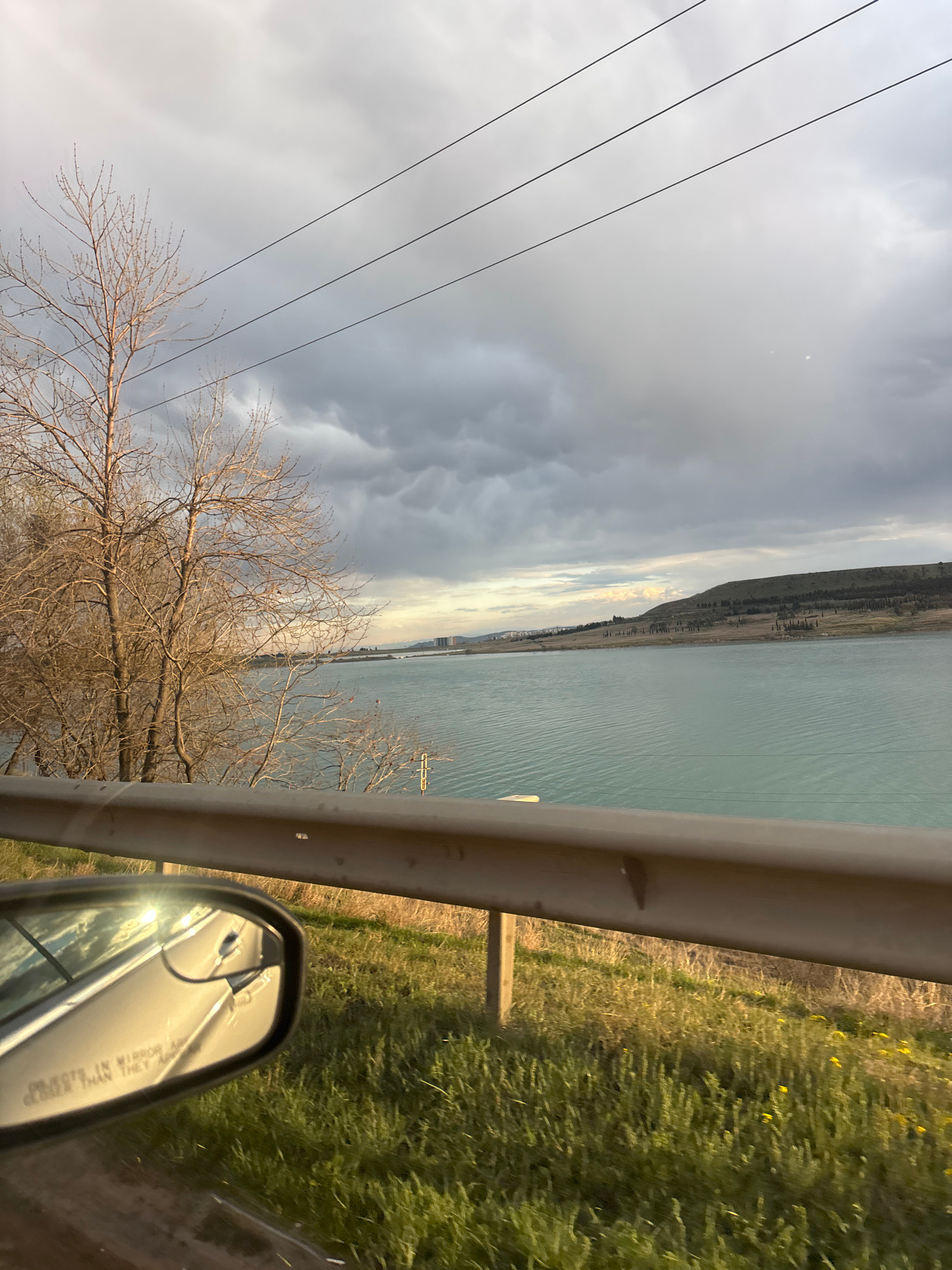 The image depicts a view from a moving vehicle, possibly a car. The landscape includes a large body of water with a shoreline visible in the distance. A guardrail is in the foreground, partially obstr…read more