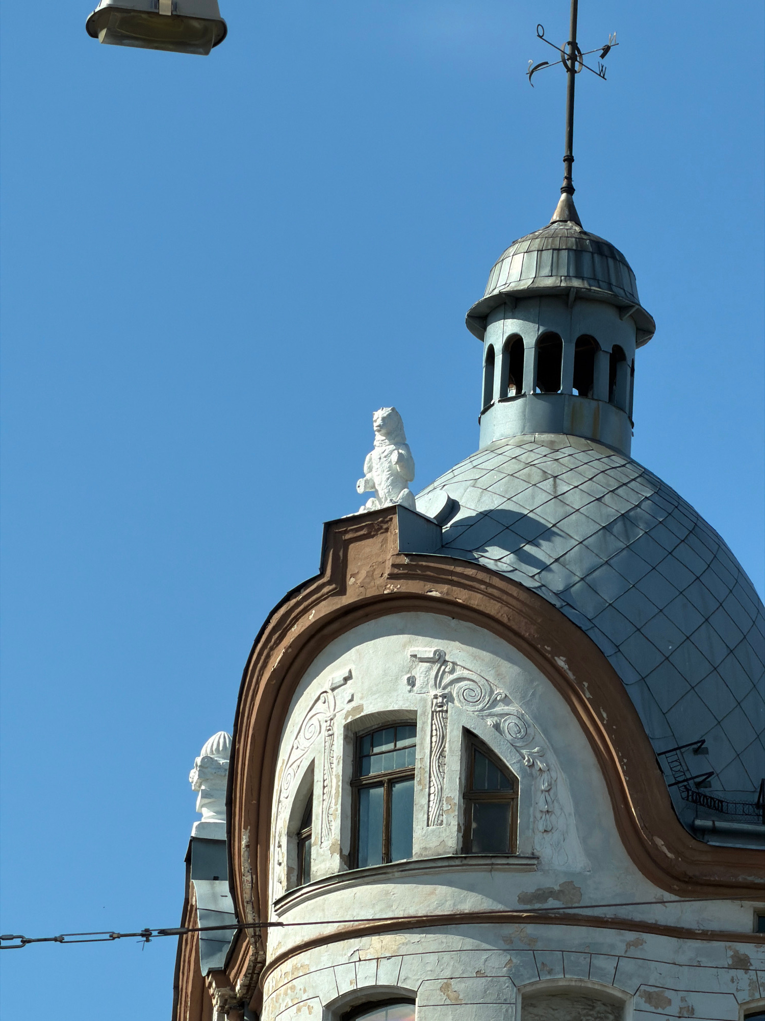 The image shows a fragment of the architectural ensemble on Alberta Street in Riga, Latvia, renowned for its Art Nouveau buildings. The composition emphasizes a decorative corner turret with a metal-t…read more