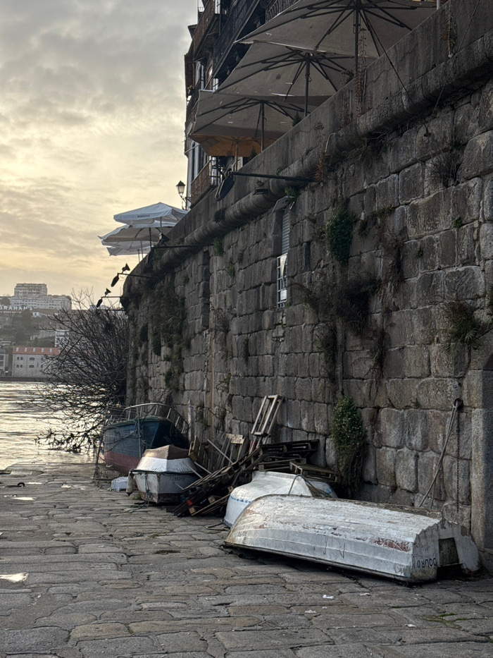 A row of boats rests along a stone embankment, shadowed by trees and partially obscured by pallets. Above, grey umbrellas extend from a building, their metal frames prominent against a cloudy sky. The…read more