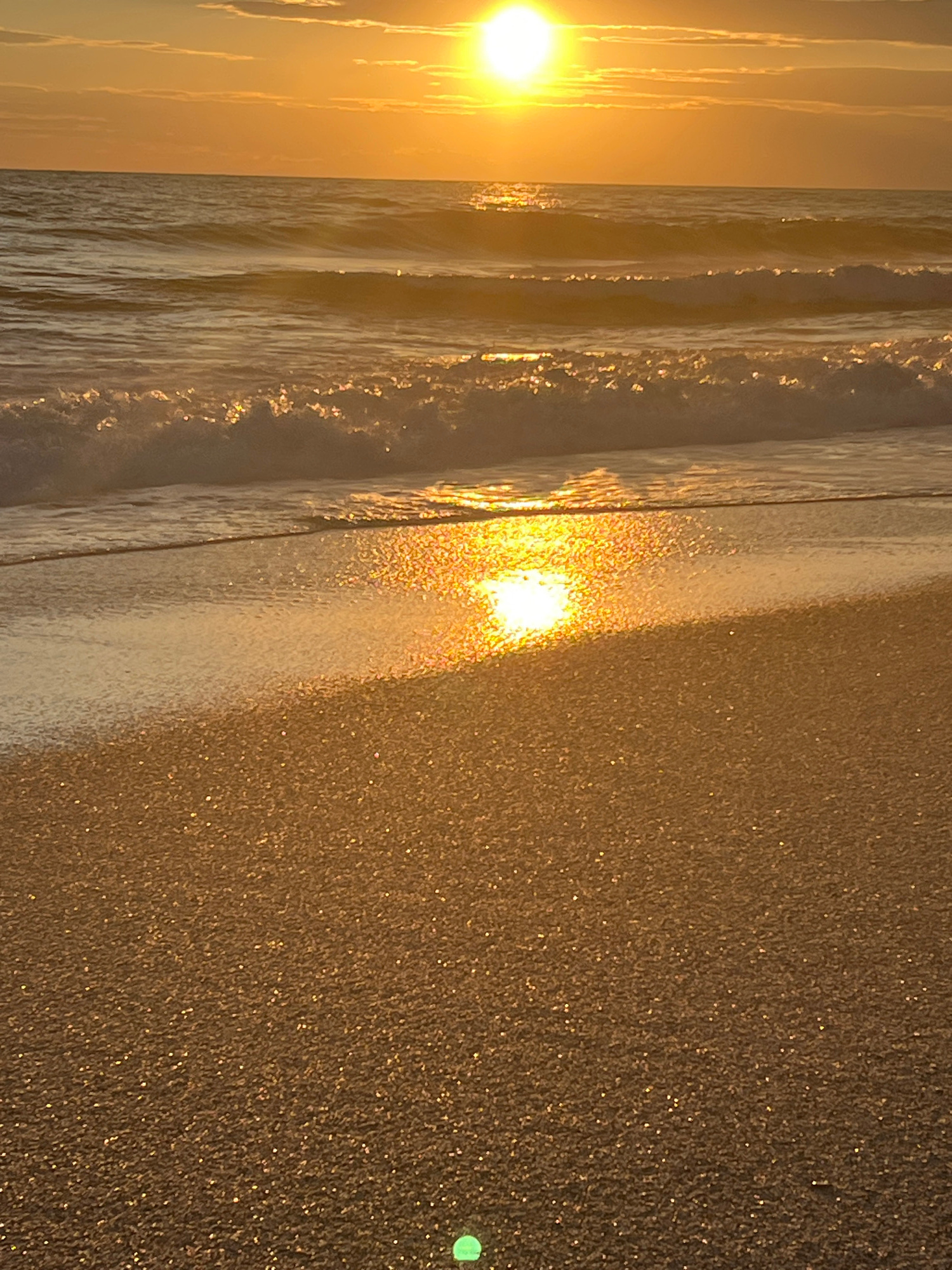 The image depicts a beach scene in Alanya, Turkey, during sunset. The sun, positioned at the top left, casts a golden hue across the water and sand. Gentle waves lap the shore, creating a textured sur…read more