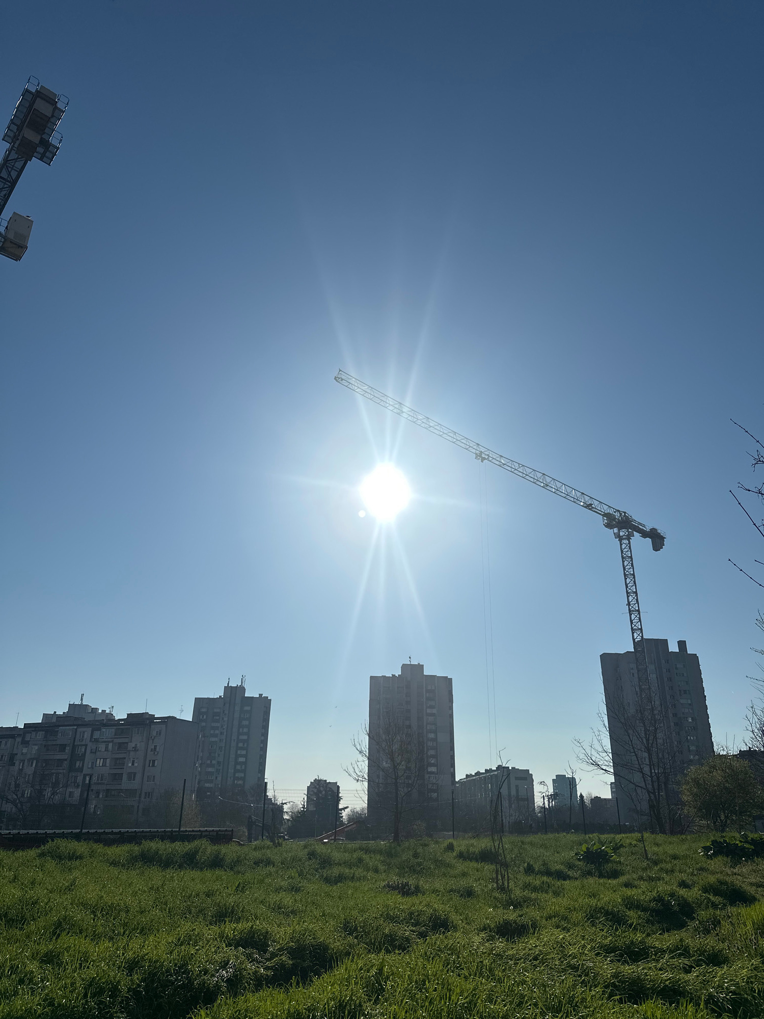 The image presents a view of an urban area. In the foreground, there's a patch of green grass, likely a park or open space. In the background, there are several high-rise buildings, suggesting a resid…read more