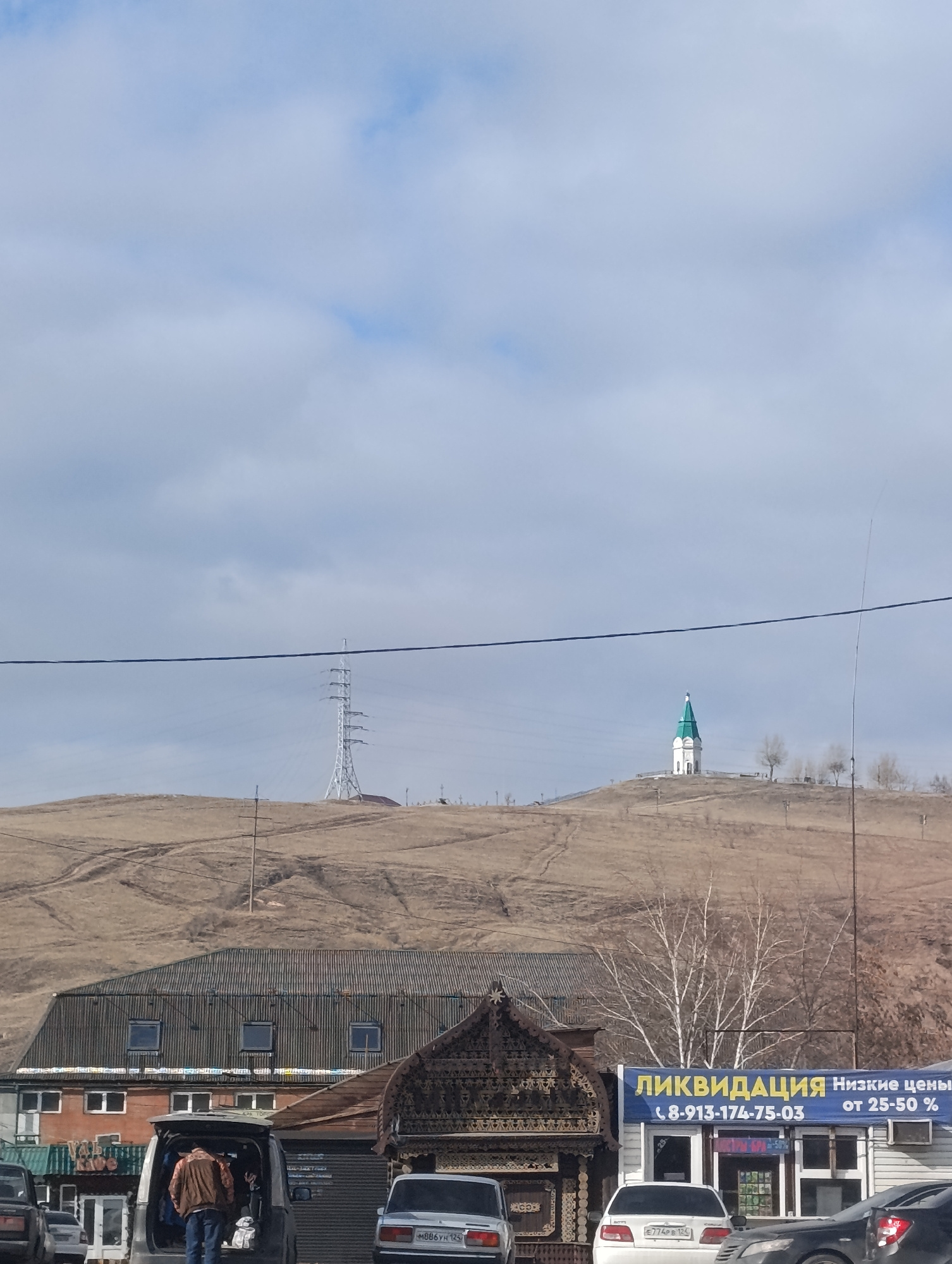 This image captures a wide view of a town situated at the base of undulating, dry hills under a cloudy sky in Krasnoyarsk, Russia. In the foreground, a street scene unfolds with various buildings and…read more