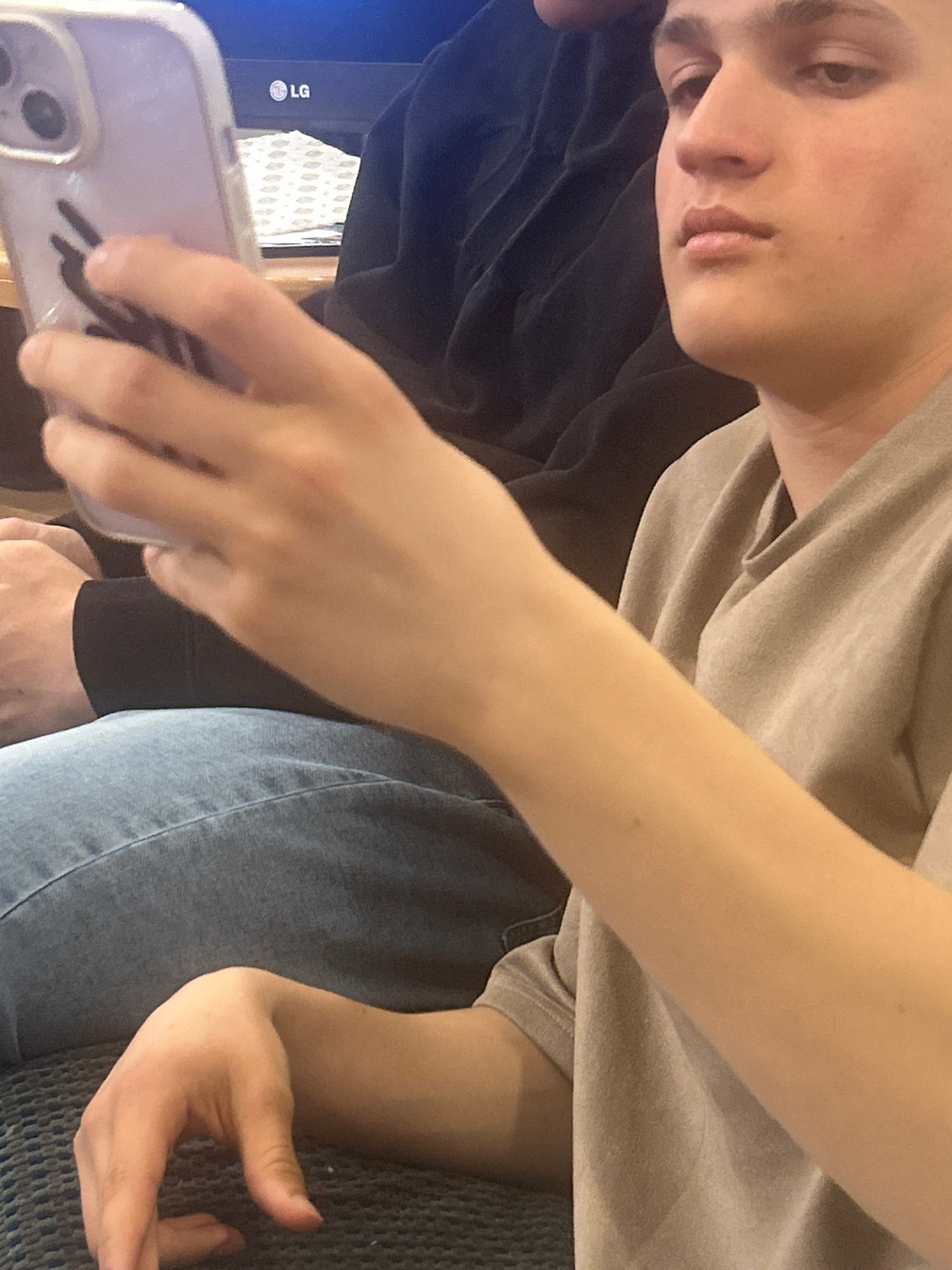 A person, likely male, is holding a smartphone with a light-colored case in their left hand. The phone's camera is visible. The person is wearing a light beige t-shirt and blue jeans. Part of a blackβ¦read more