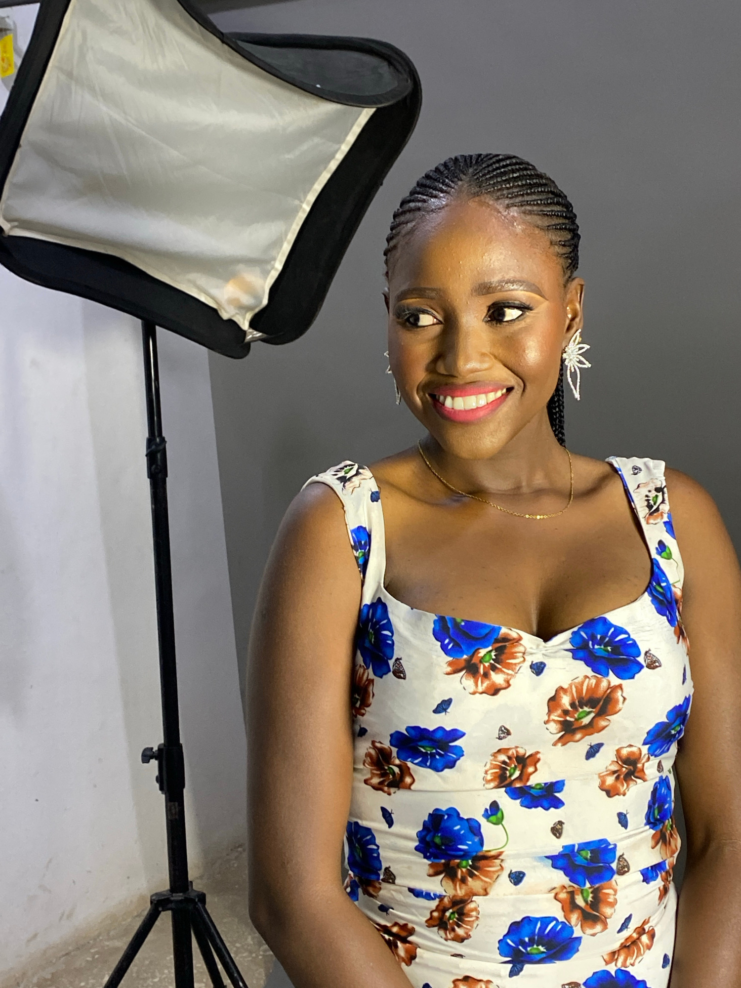 This portrait photograph features a young Black woman smiling broadly and looking directly at the viewer. She has a dark complexion, and her hair is neatly styled in cornrows or braids. She is wearing…read more