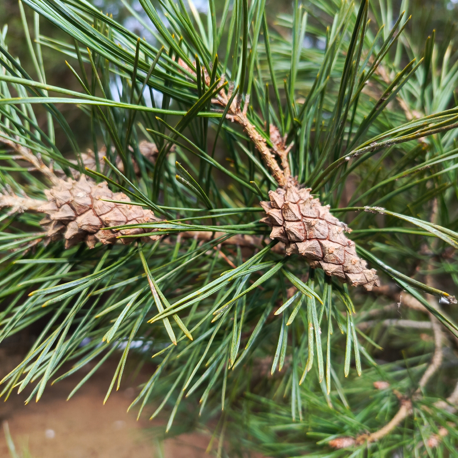A close-up shot shows a pine tree branch with long, green needles and two small, brown pine cones. The cones are attached to the branch, and the needles surround them, creating a dense, textured appea…read more