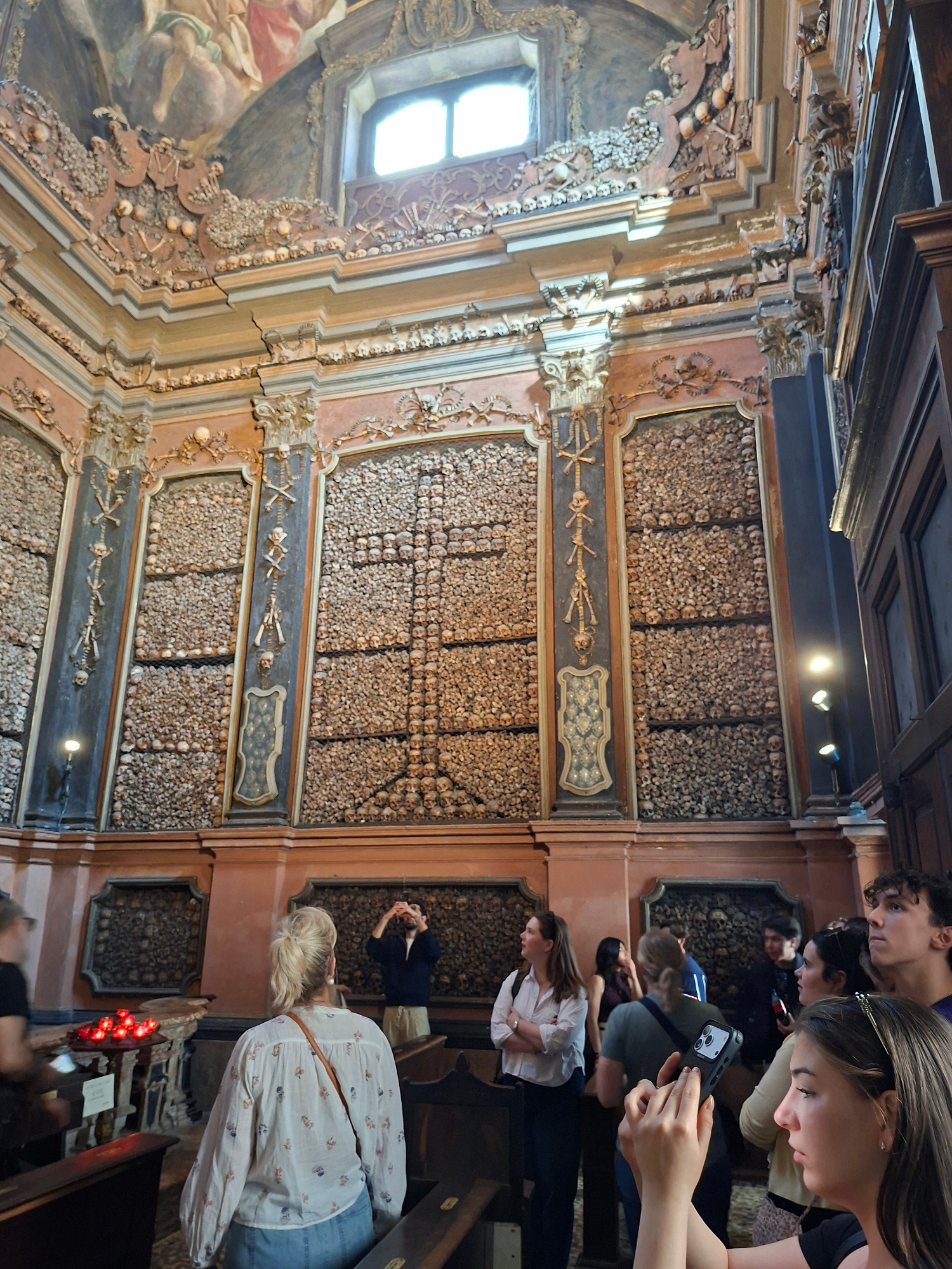 A wide-angle shot of the ossuary in San Bernardino alle Ossa, Milan, Italy, shows visitors looking at displays of skulls and bones. A line of visitors stands along the right side of the image, their a…read more