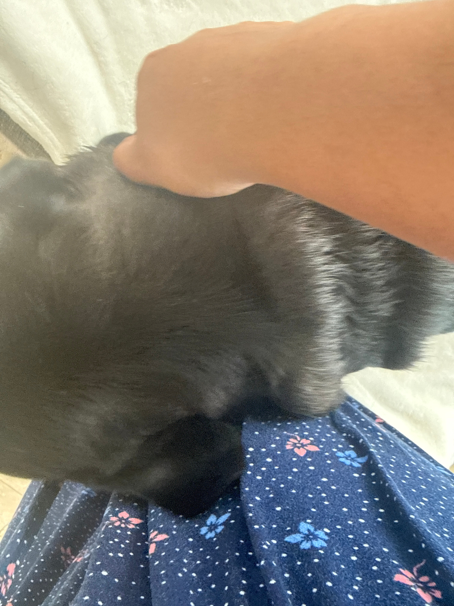 A black dog is being petted. A person's hand rests on the dog's head. The dog is near a blue piece of fabric with a floral pattern. The background includes a white surface. The location is unknown, an…read more