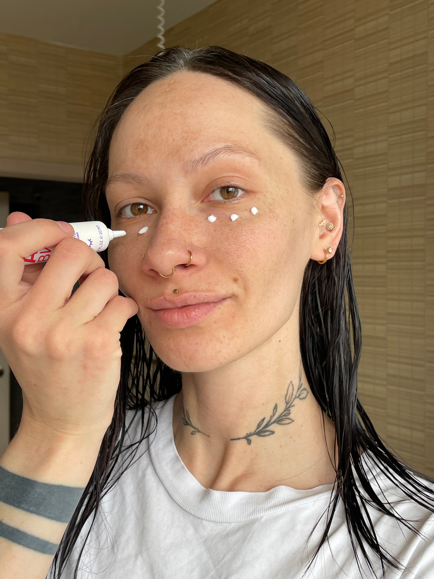 A person is shown from the chest up, likely in a personal setting, with wet, dark hair. They are holding a small white tube with red lettering. There are small white dots on the person's face near the…read more