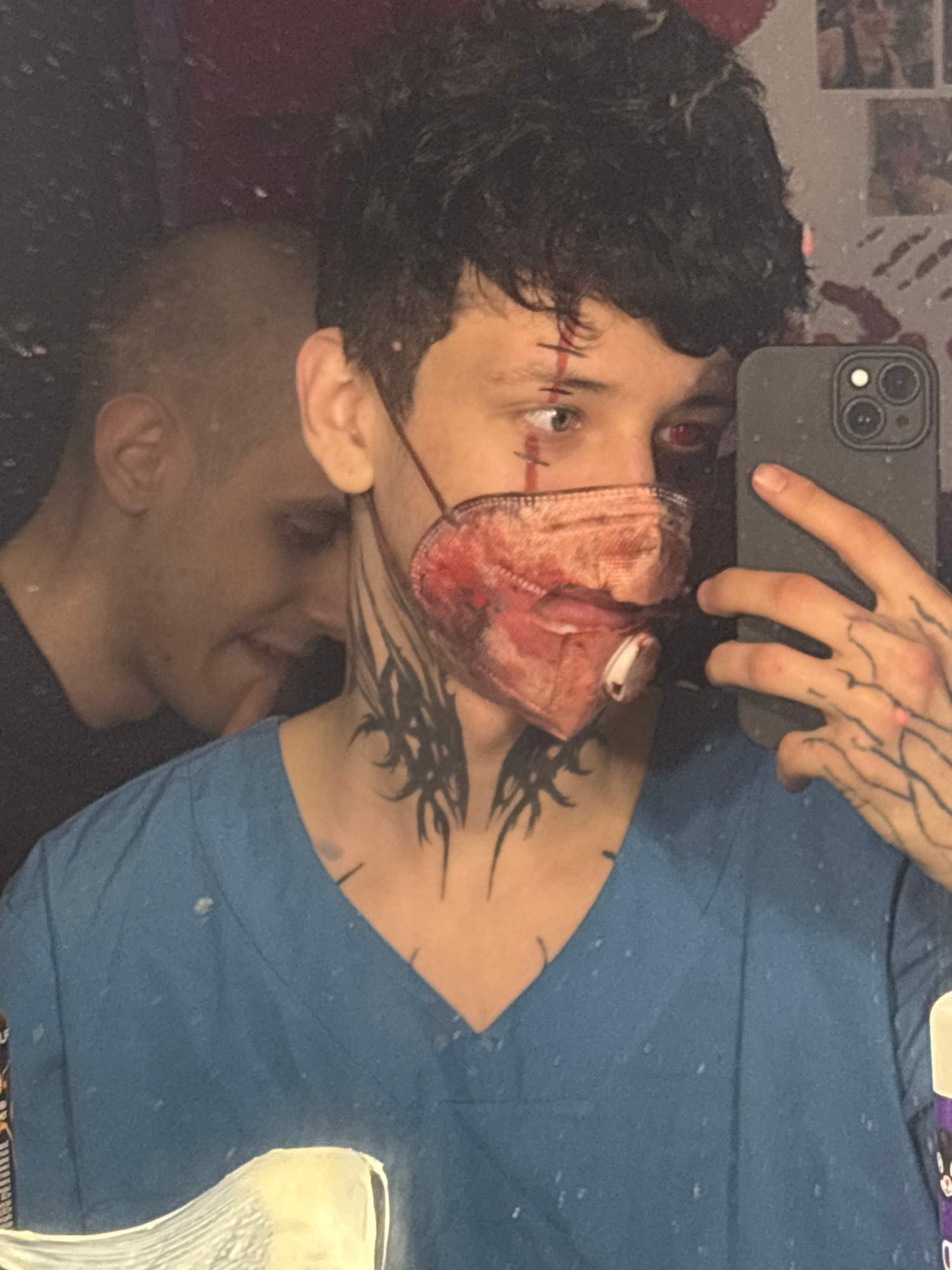 A selfie taken in a mirror shows a young person wearing a blue shirt. The person has dark hair, and appears to be wearing theatrical makeup to simulate injuries. The makeup includes stitches near the…read more