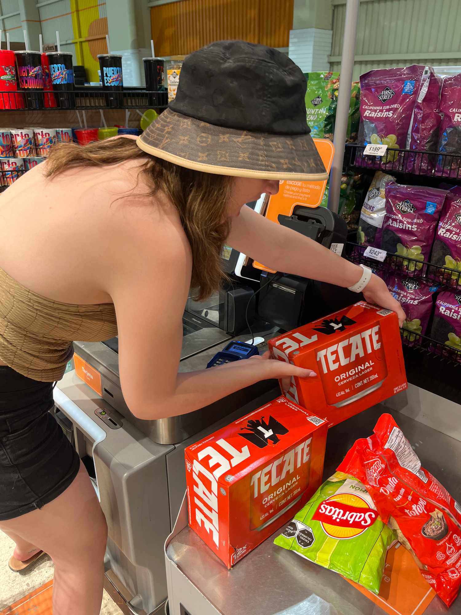 A woman with brown hair wearing a Louis Vuitton-branded hat, a tan strapless top, and black shorts is at a checkout counter. She is placing two 12-packs of Tecate beer on the counter. Next to the beer…read more