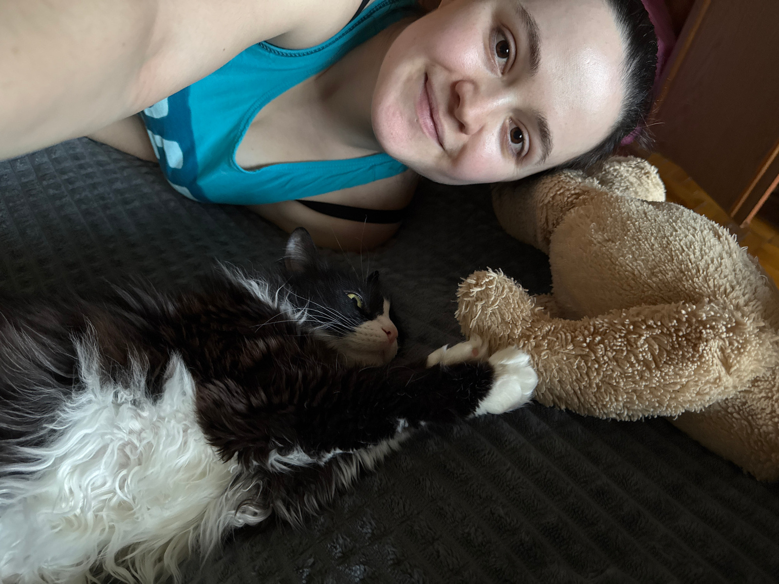 A woman is taking a selfie with a long-haired black and white cat and a brown teddy bear on a gray textured blanket. The woman is wearing a blue tank top. The cat is lying upside down with one paw touβ¦read more