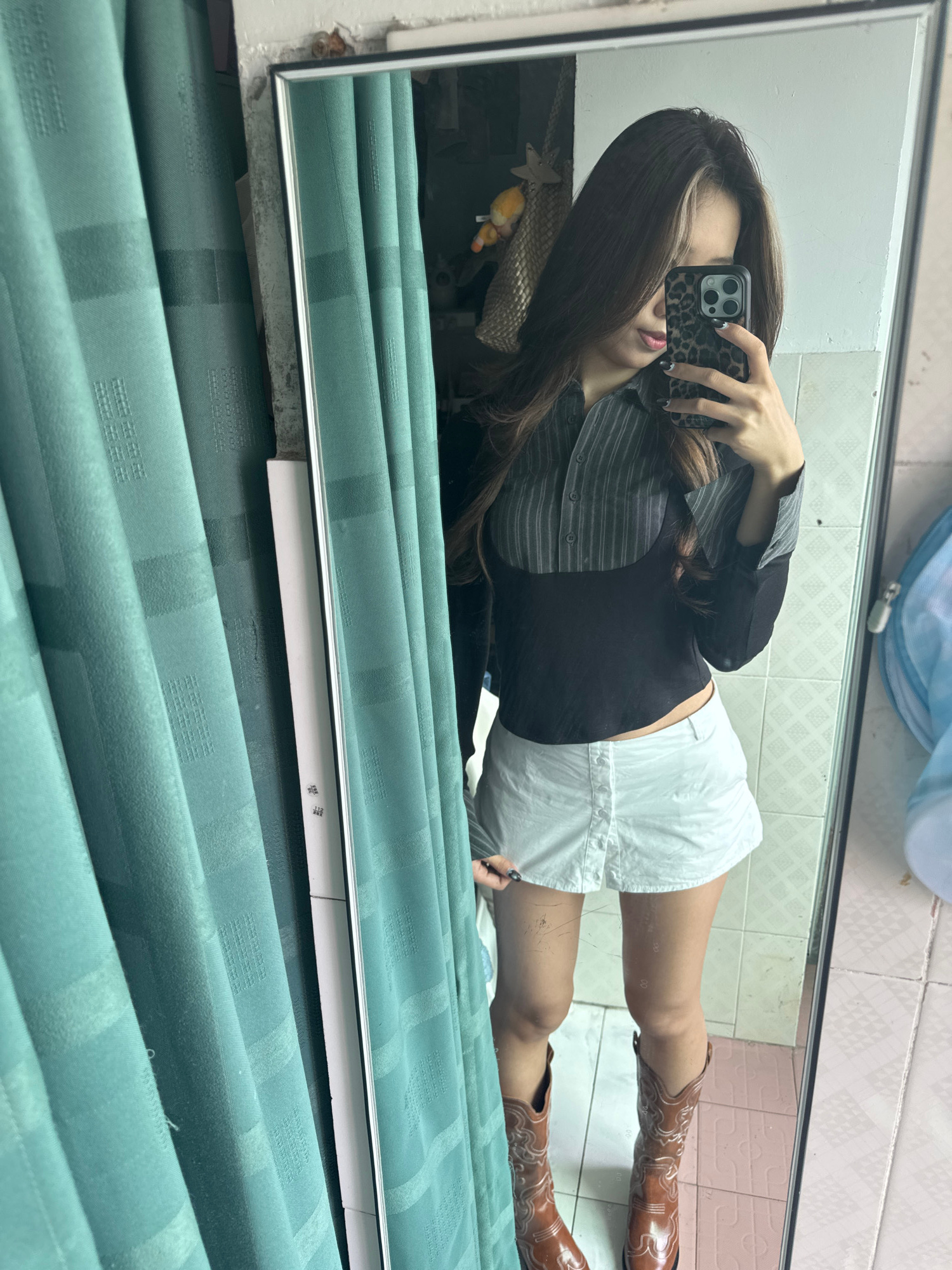 A woman is taking a mirror selfie. She is wearing a dark top, white shorts, and brown boots. She is holding a phone with a leopard print case. The mirror is positioned against a tiled wall. Below the…read more